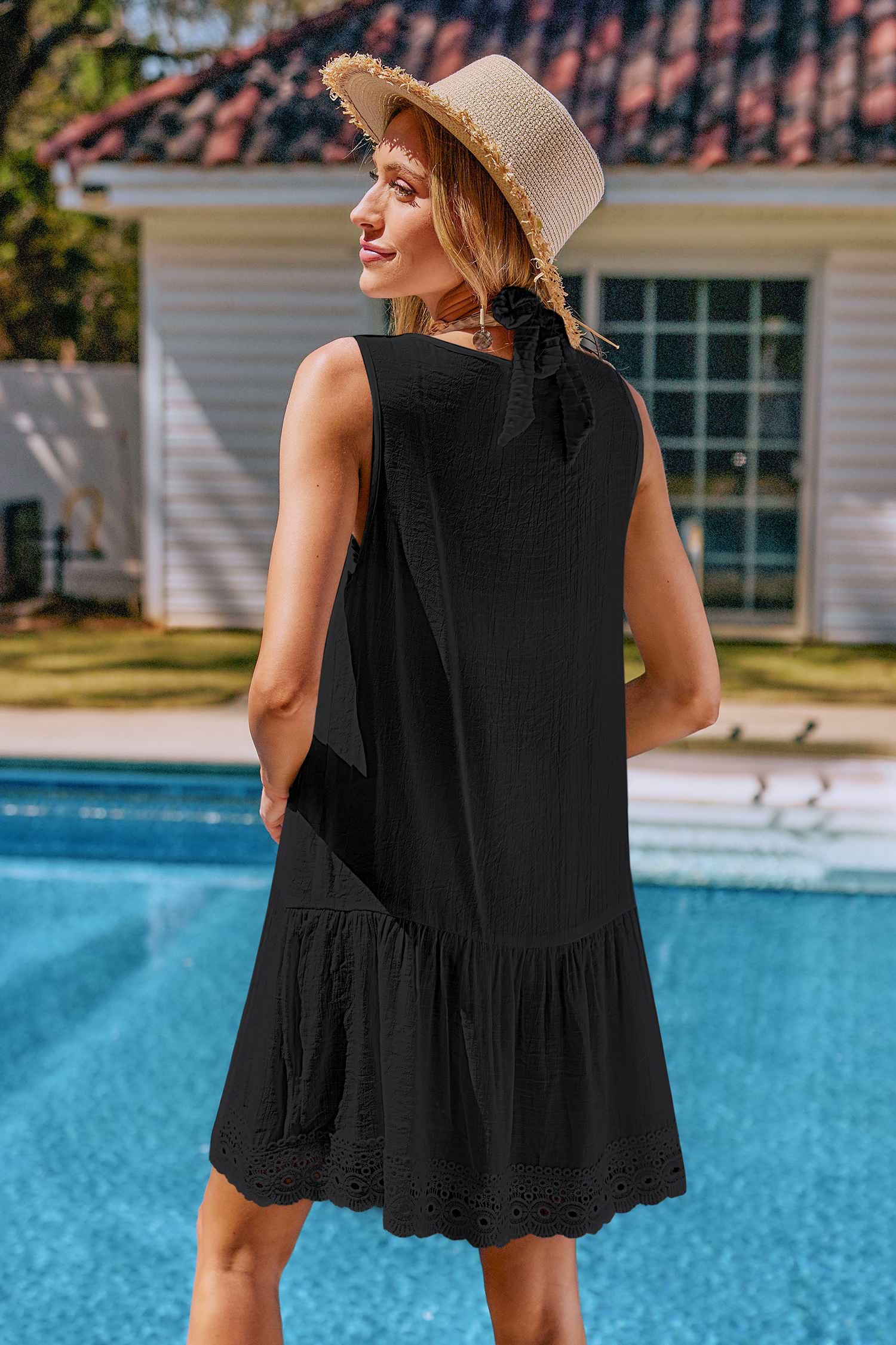 Designed to layer over swimwear, this airy cover-up features sheer fabric for extra breathability, perfect for warm days by the water. The Easy Choice Black Cover-Up Mini Dress keeps things simple! With a V-neckline and sleeveless mini cut, it's an easy layer for laid-back days and beachy plans.