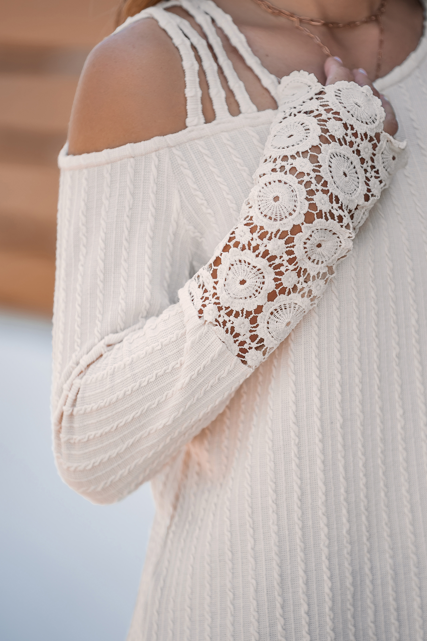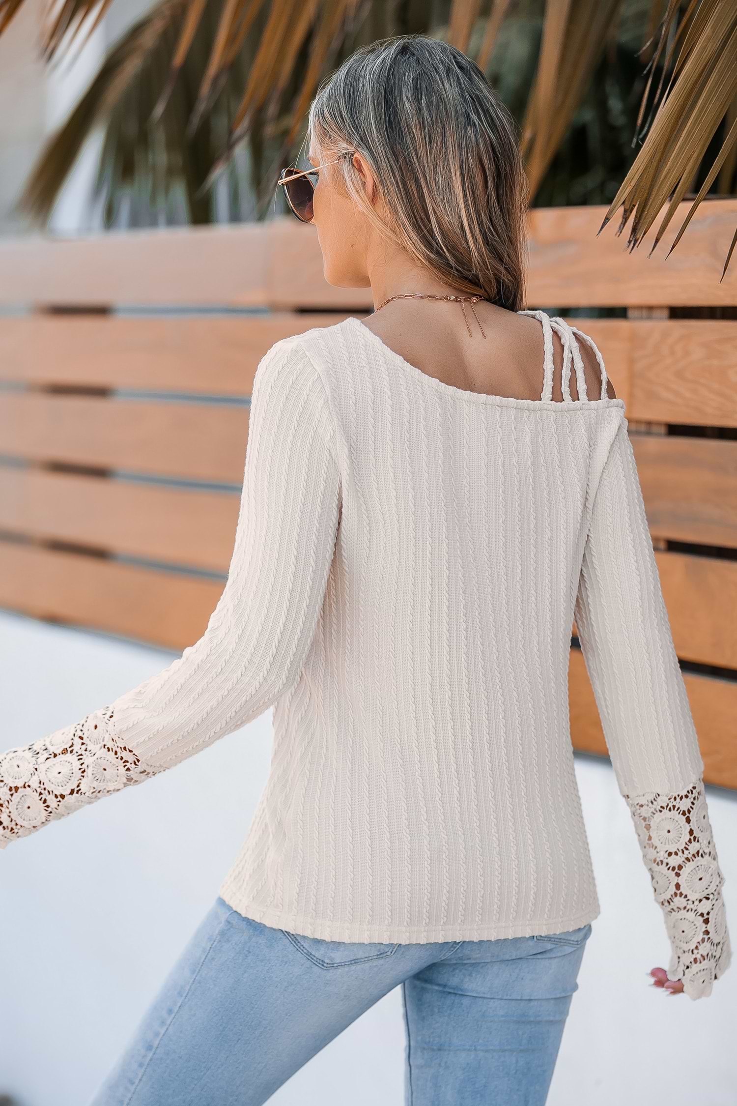 HomeBeige Asymmetrical Neck Long Sleeve Lace Cuff Top