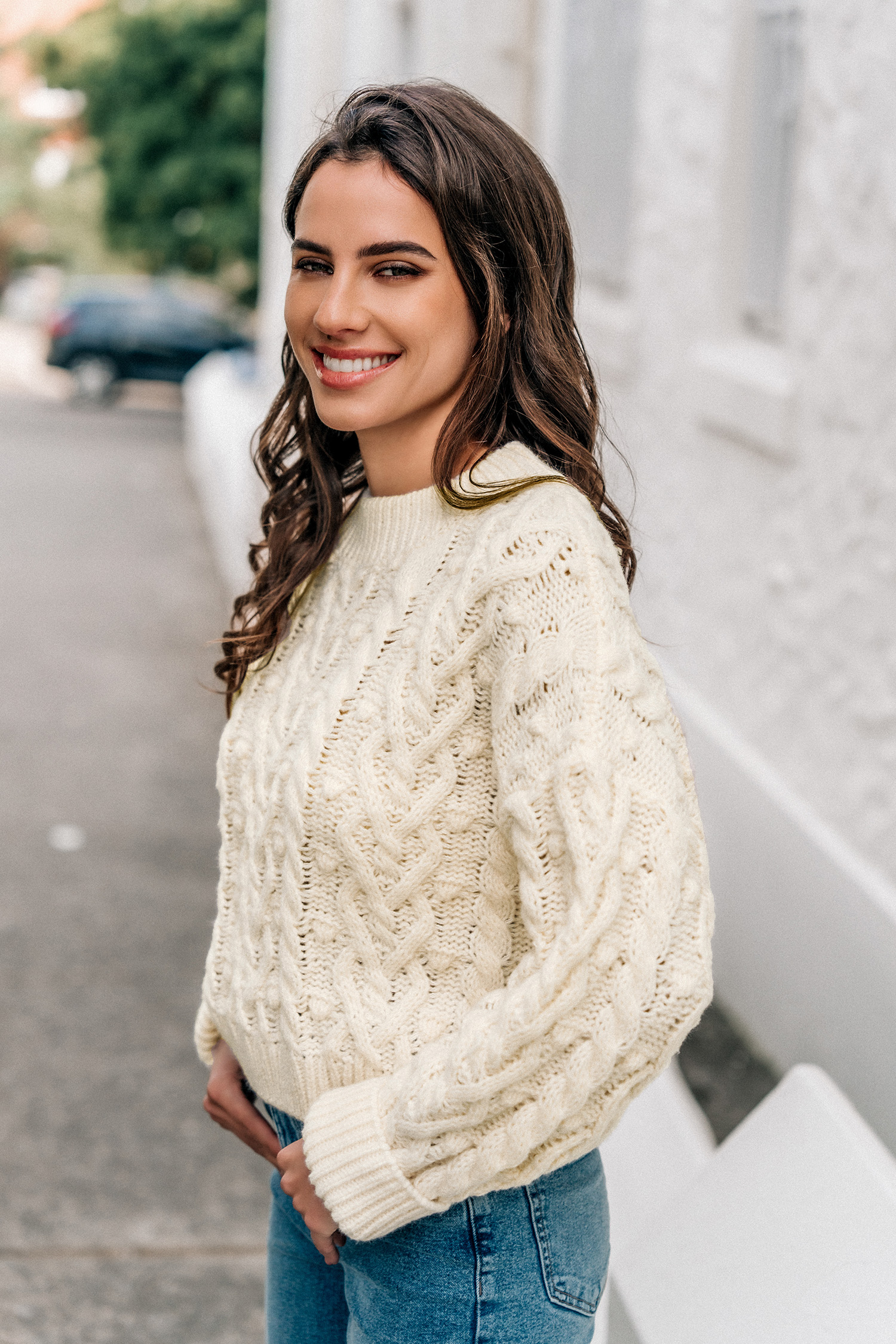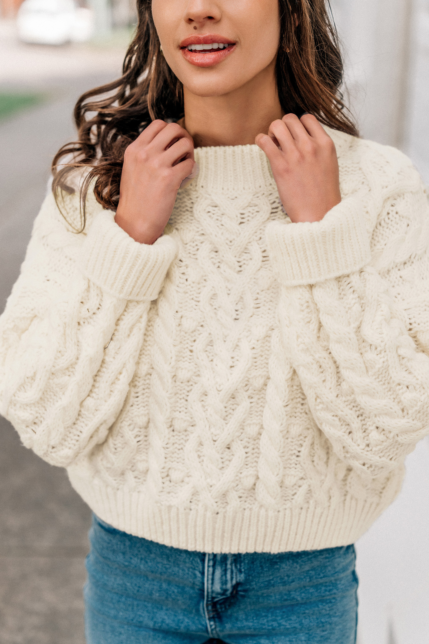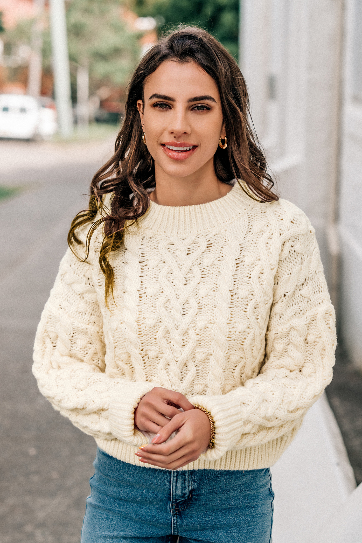 HomeBeige Cable Knit Drop Shoulder Sweater