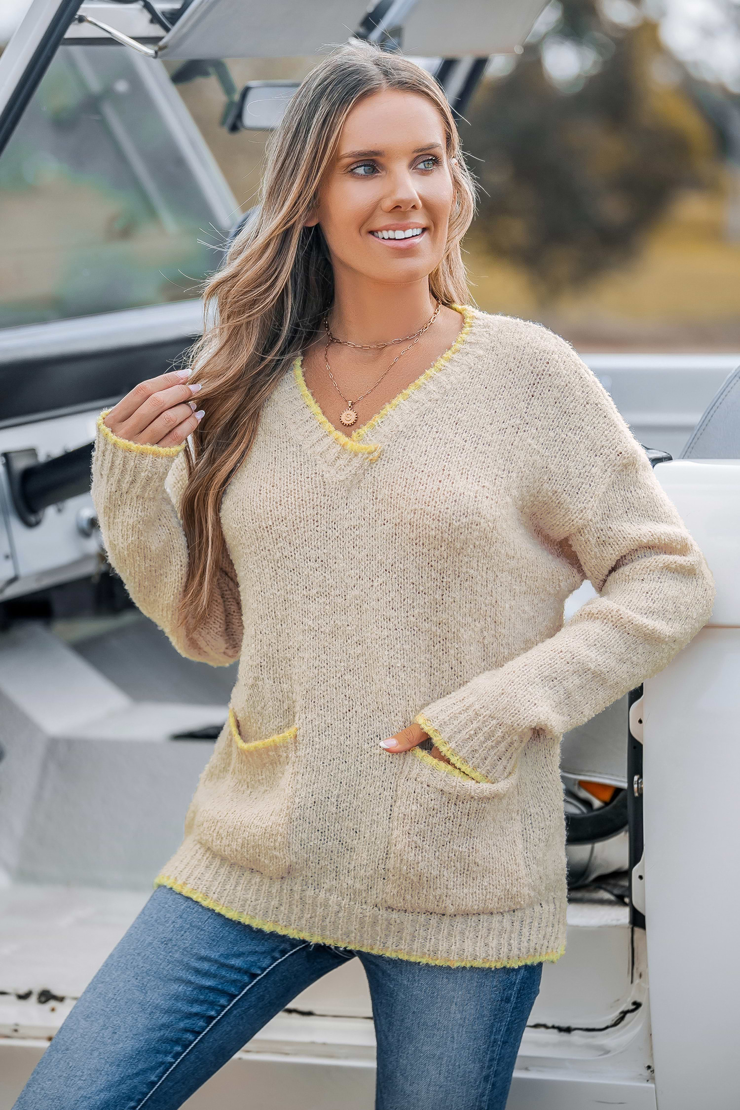 Elevate your cozy game with the Beige V-Neck Long Sleeve Patch Pocket Sweater. Featuring playful yellow contrast trim and practical patch pockets, this sweater adds a pop of color and a touch of fun to your laid-back style.