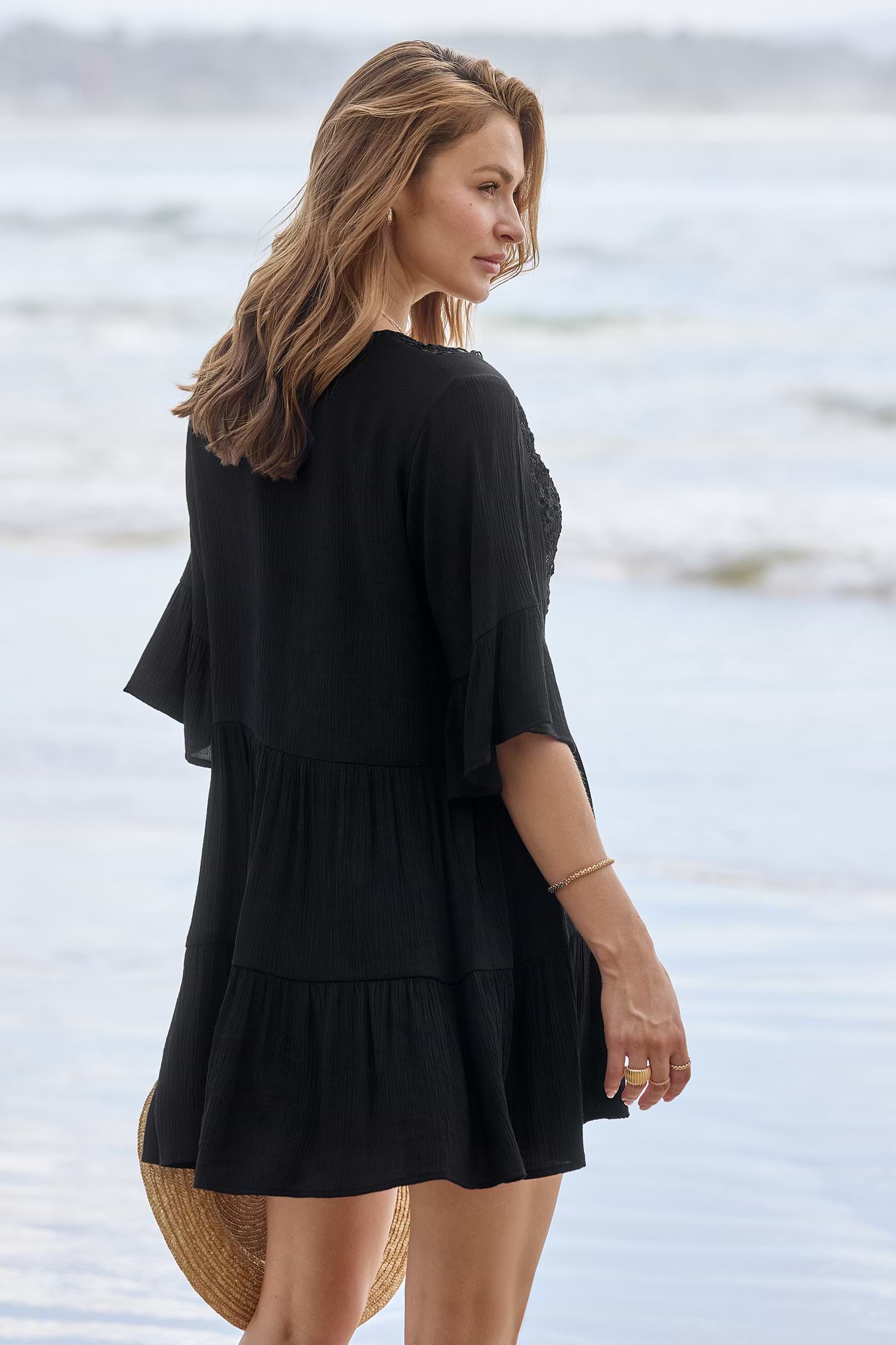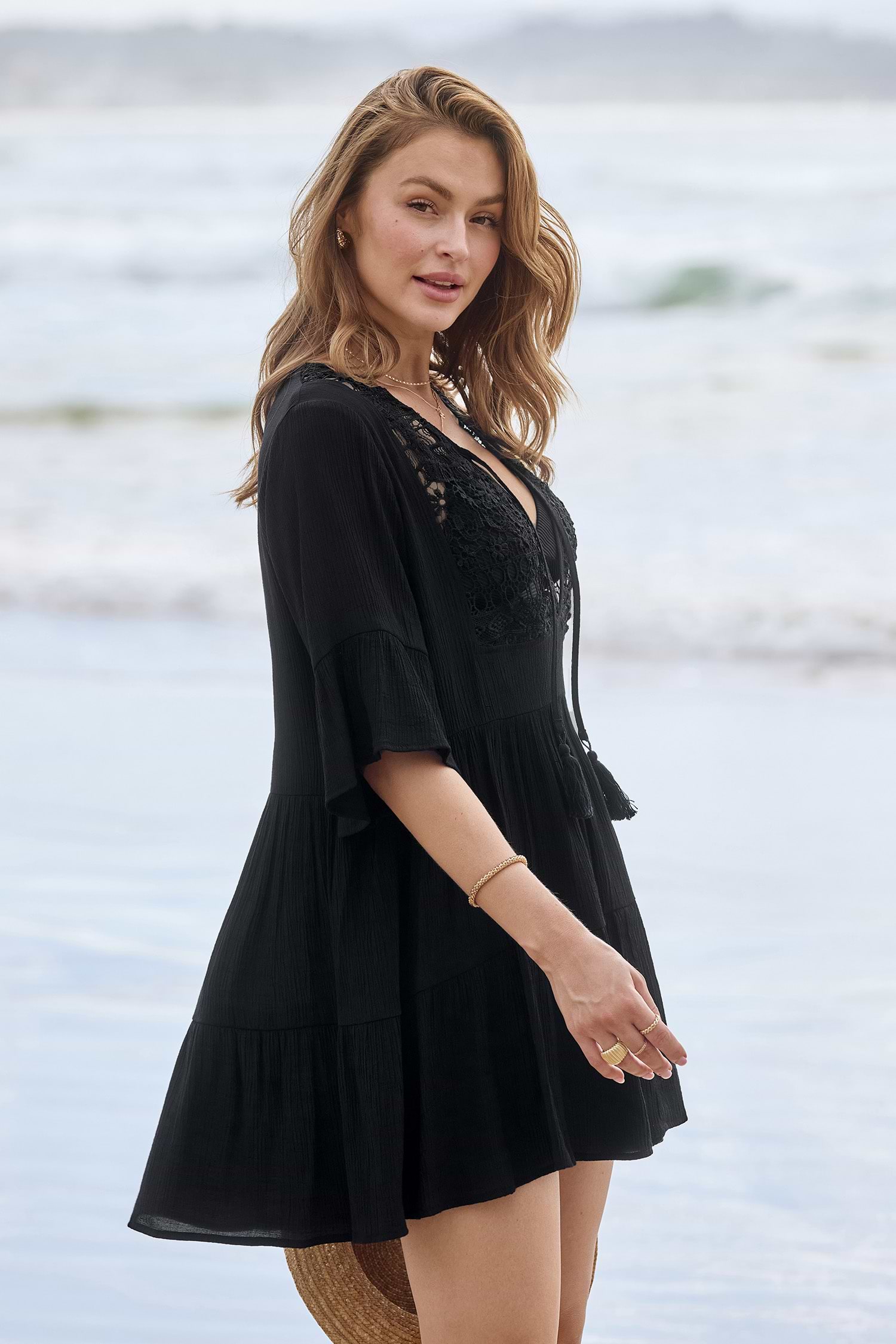 Black Half Sleeve Tassel Tie Mini Cover-Up Dress