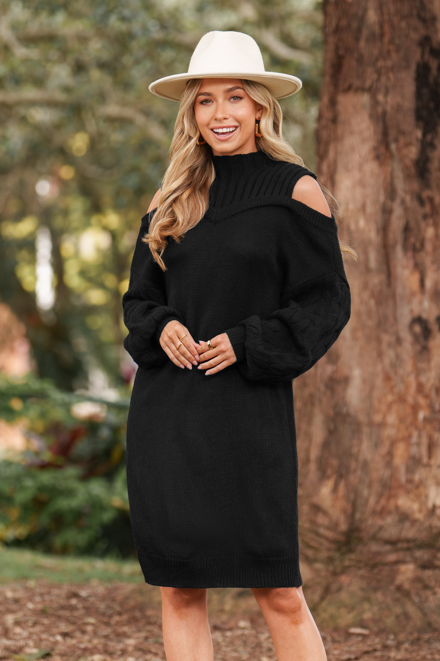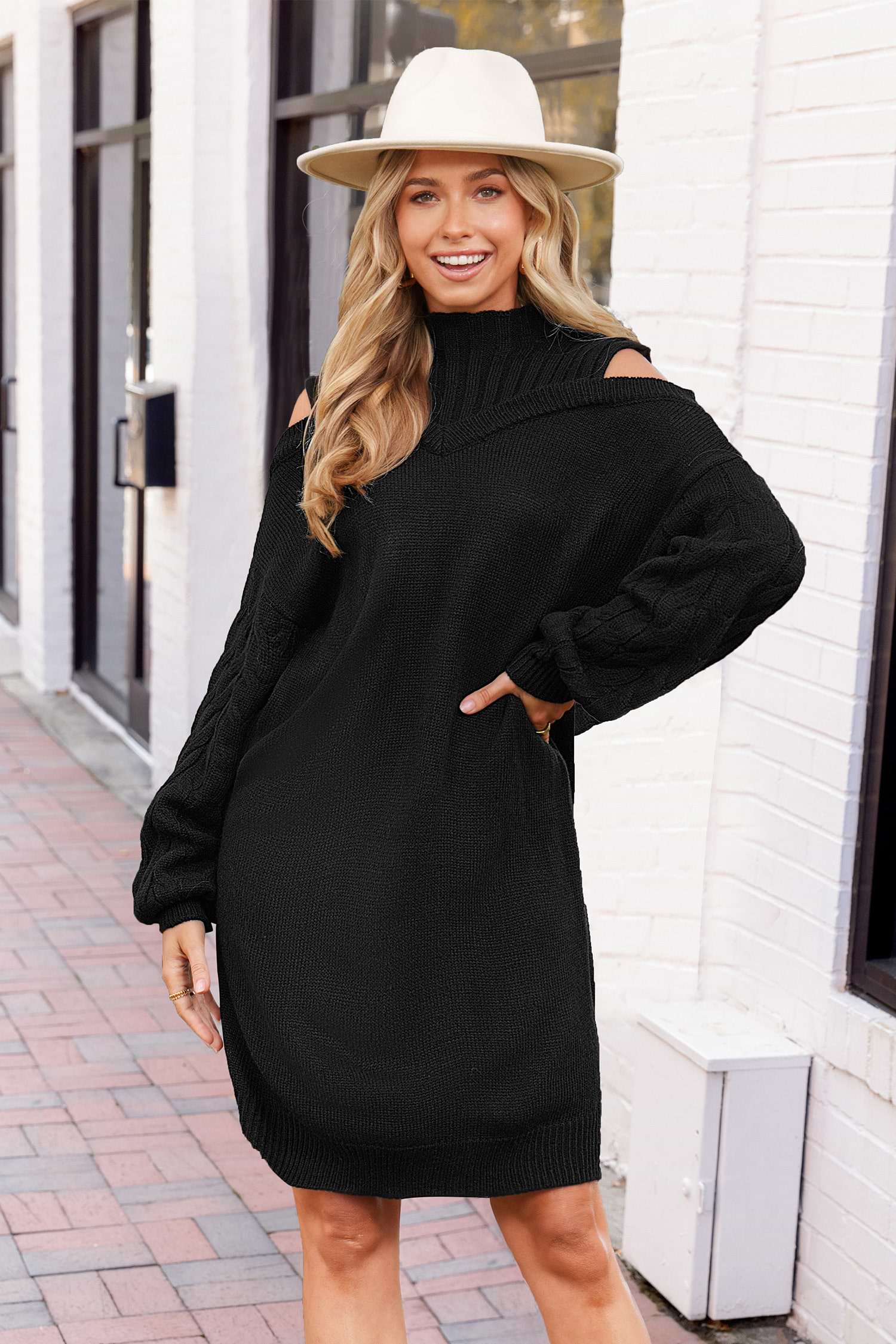 HomeBlack Mockneck Cutout Shoulder Mini Sweater Dress