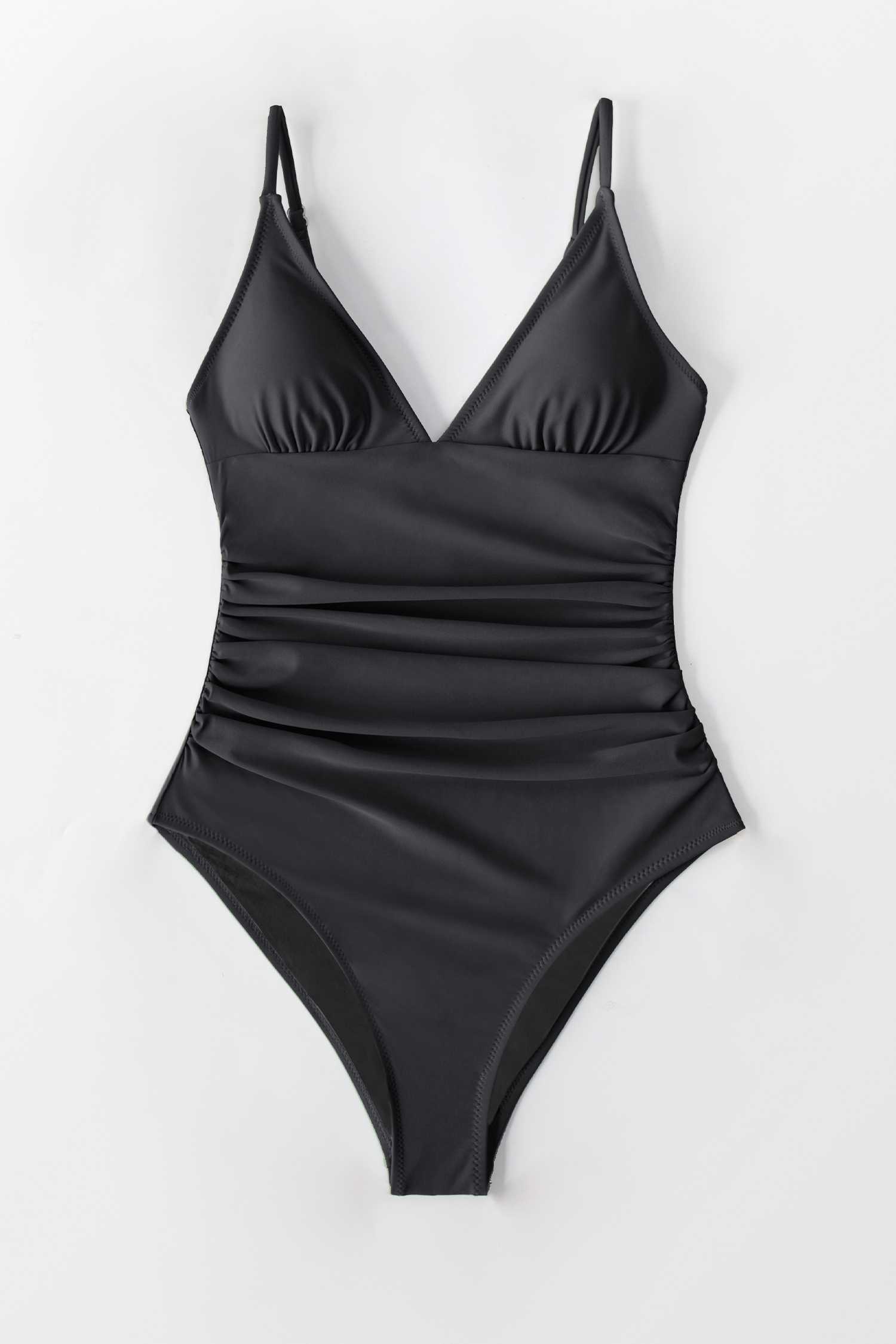 Black Shirring V Neck One Piece Swimsuit