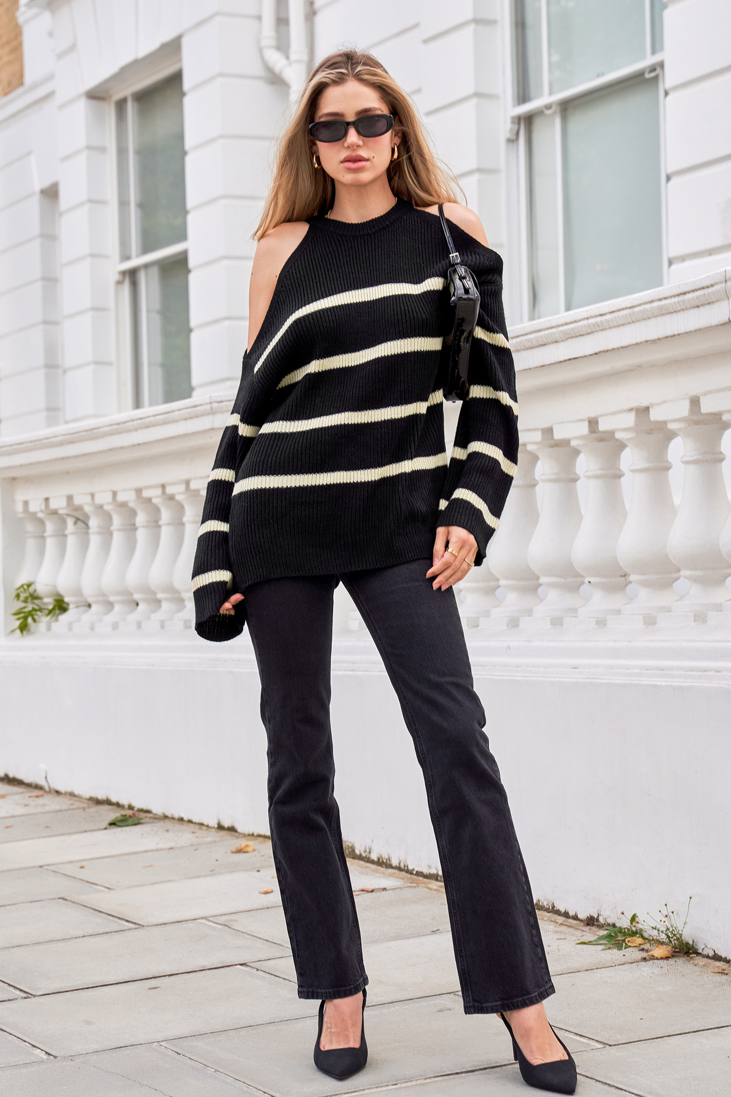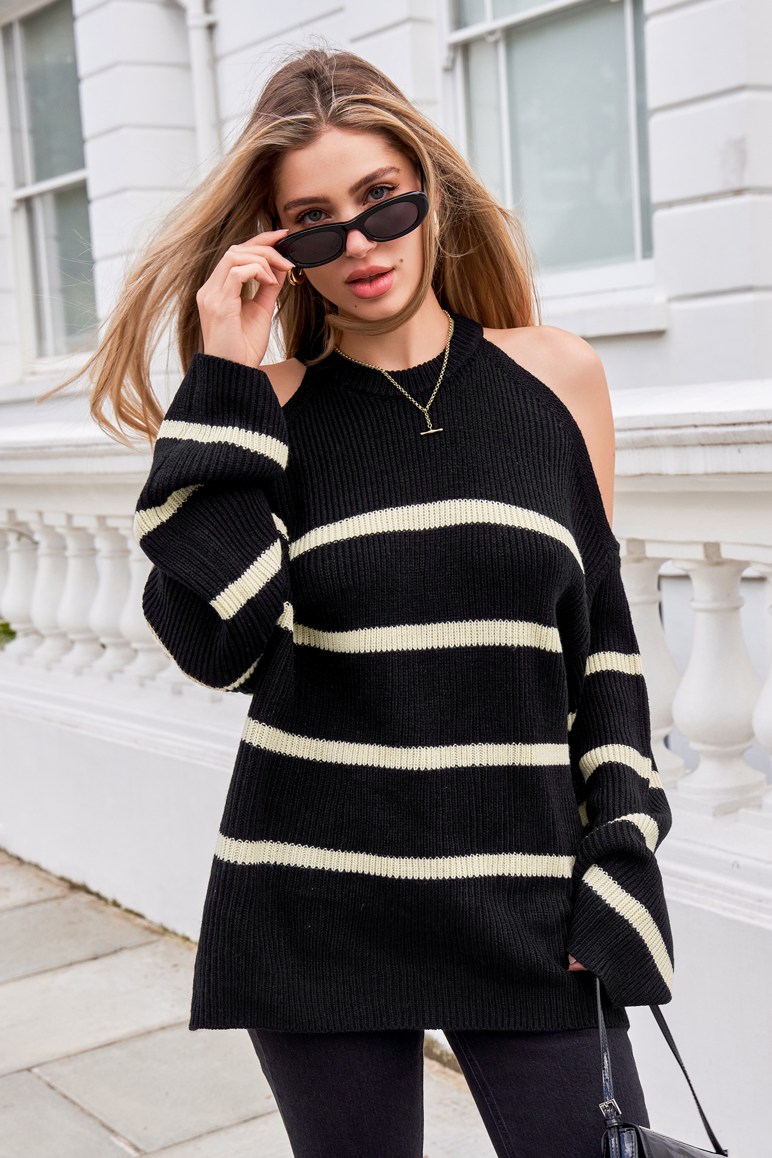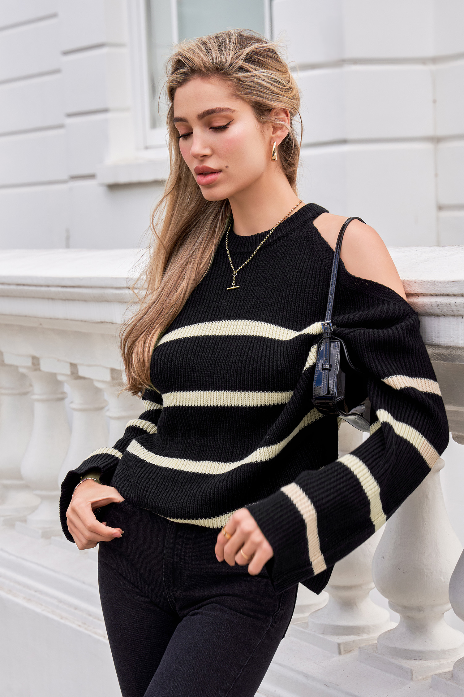 The Black Striped Cutout Shoulder Long Sleeve Sweater brings bold stripes and unexpected shoulder cutouts to the mix. It’s the perfect blend of comfort and confidence.