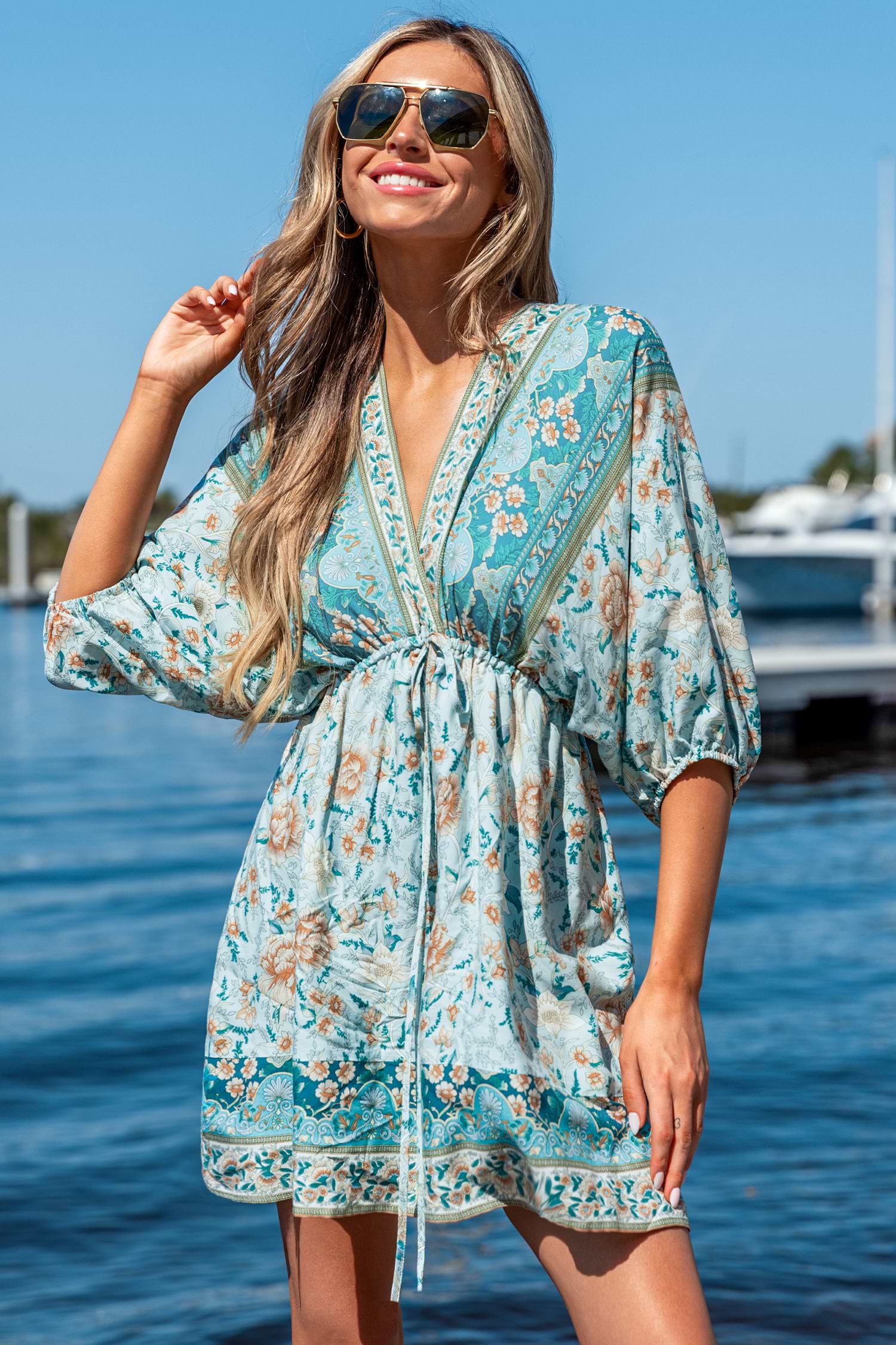 Blue Floral Plunging Mini Dress
