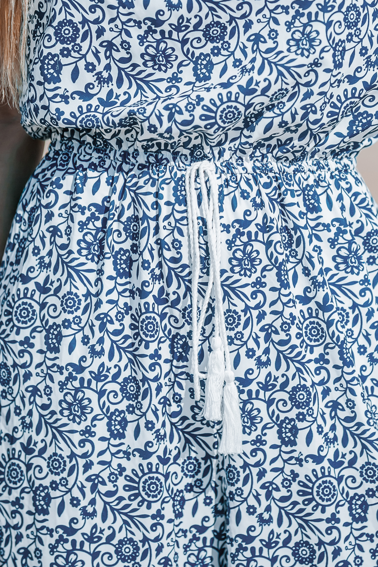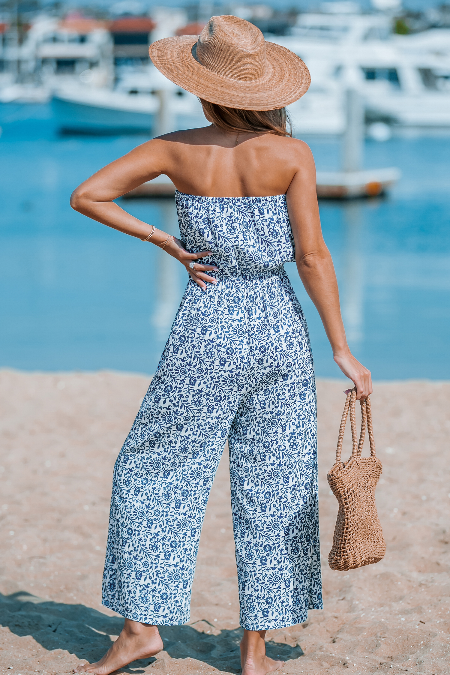 Blue Floral Swirl Tube Top Wide Leg Jumpsuit