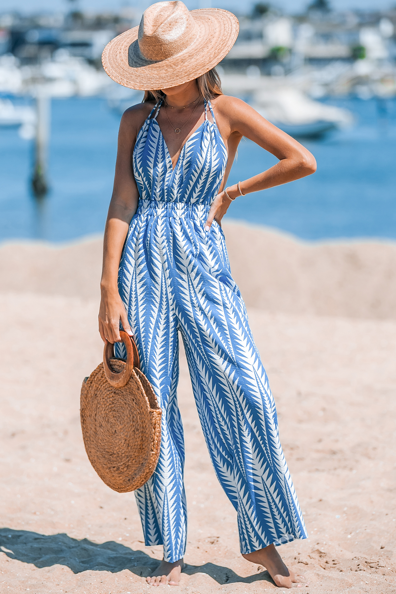 Blue Geo Sleeveless Straight Leg Jumpsuit