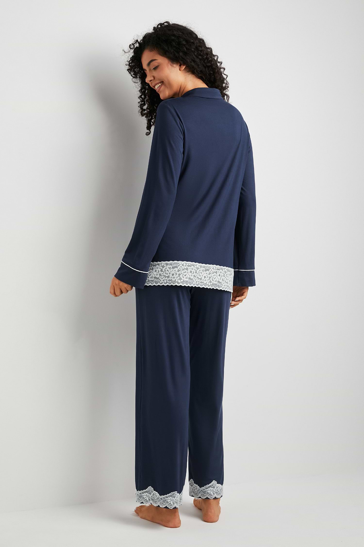 Blue Lace Trim Collared PJ Top & Pants Set