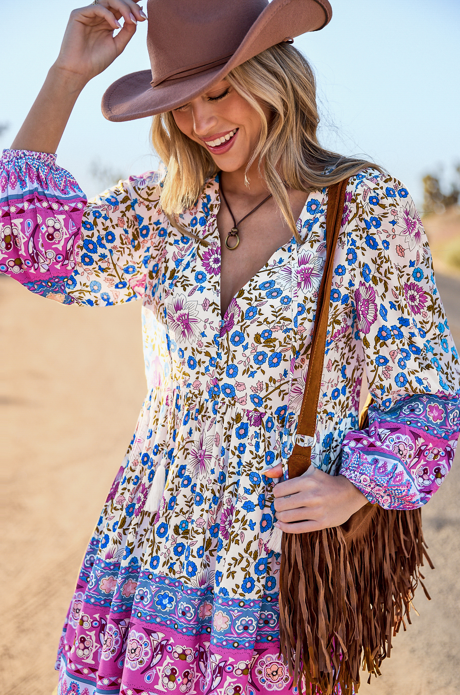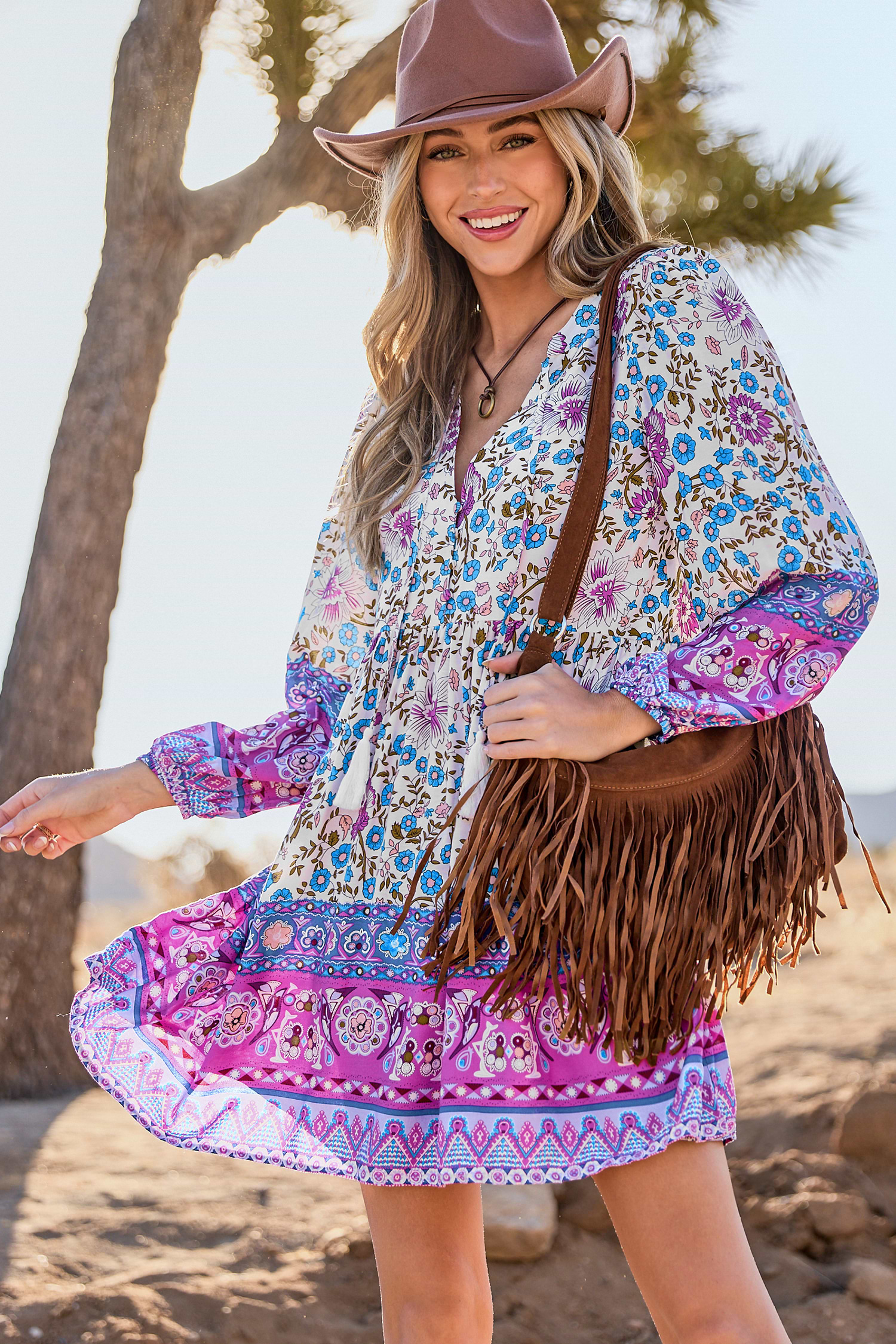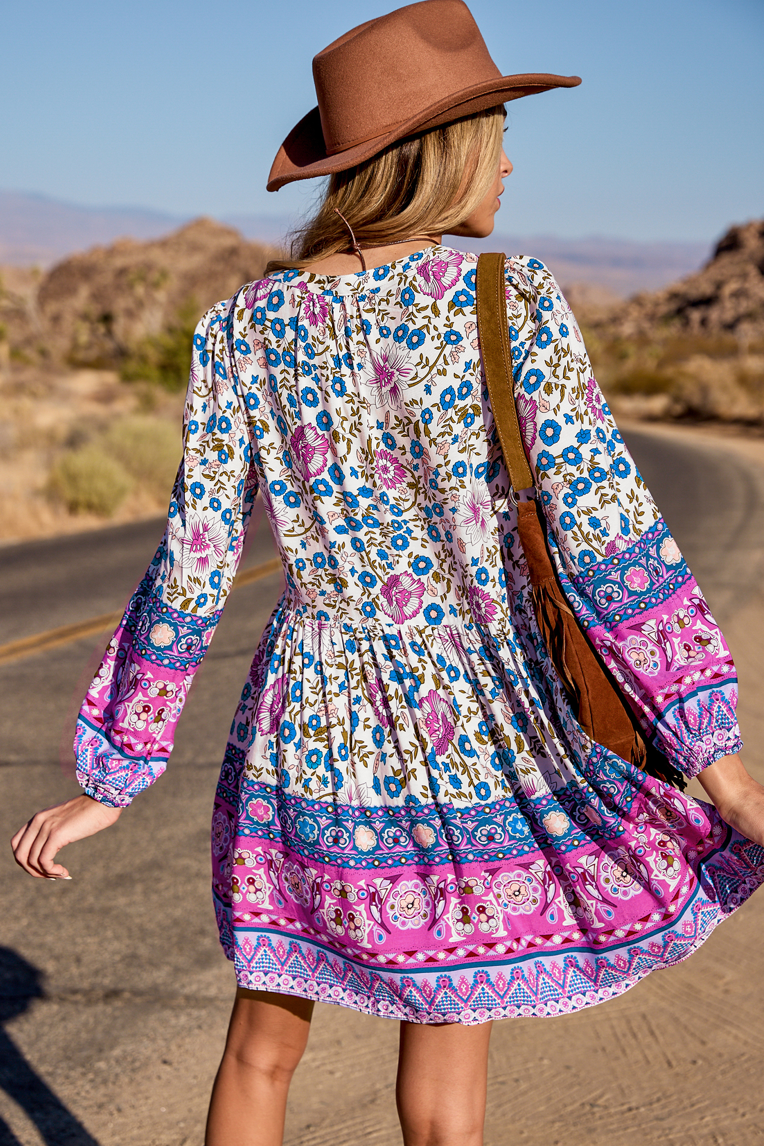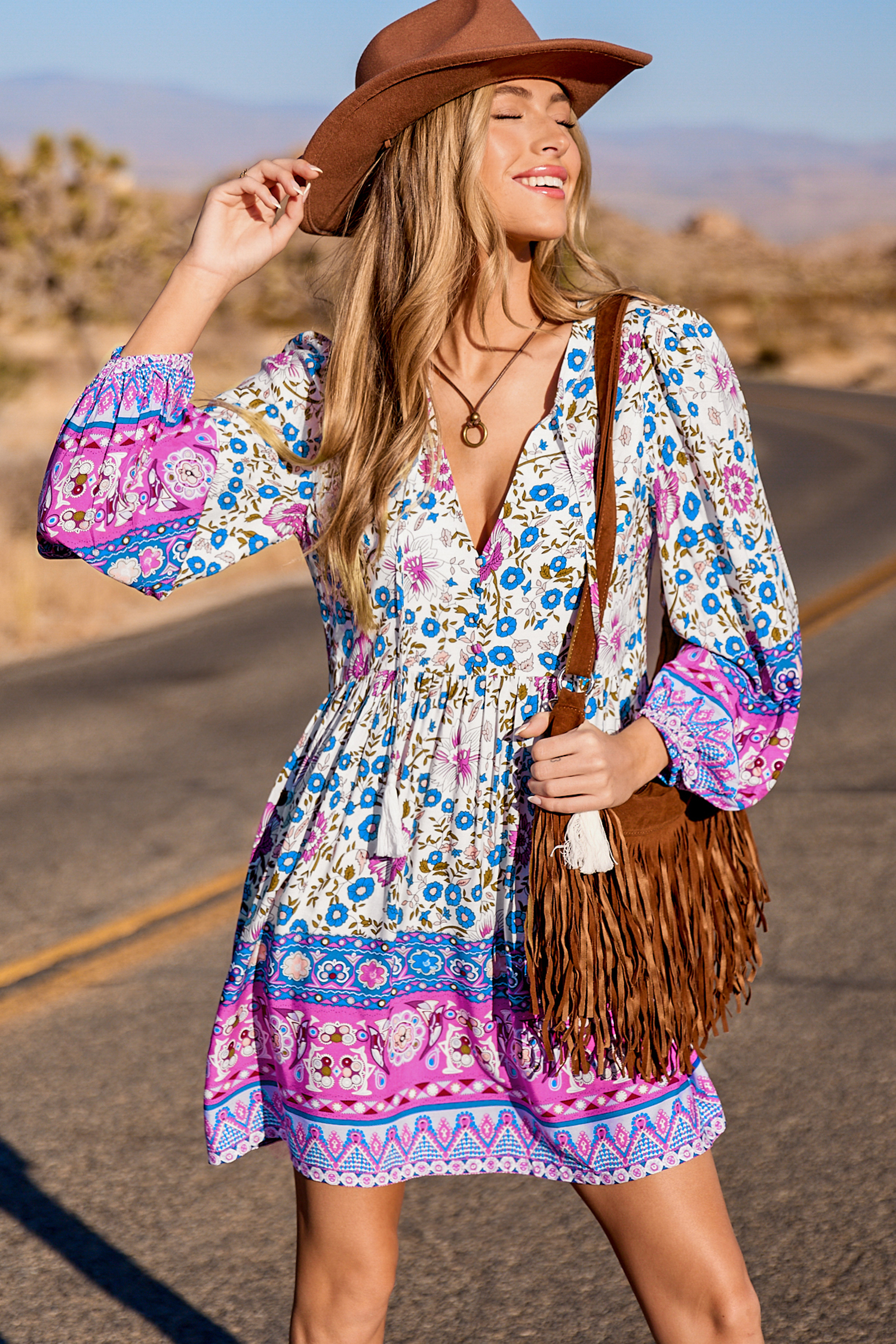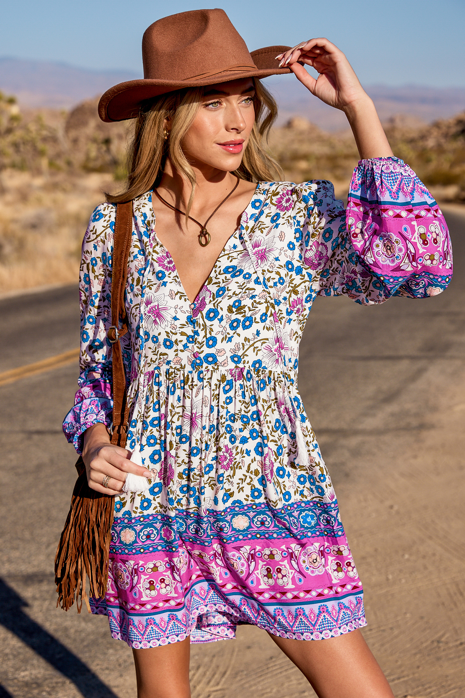 Blue & Pink Floral Plunging Puff Sleeve Mini Dress