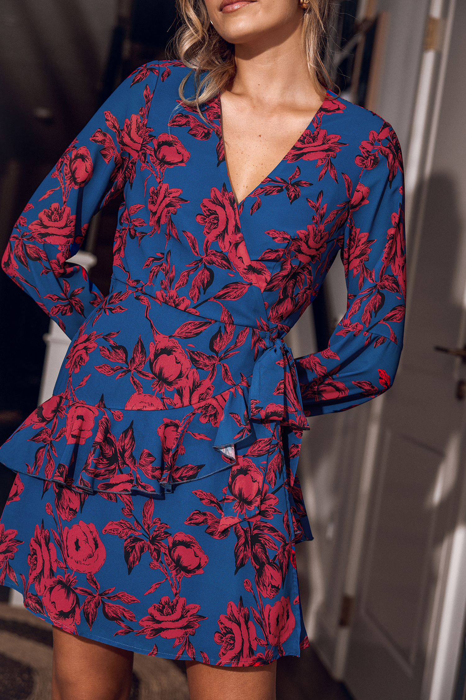 Blue & Red Floral Blouson Sleeve Mini Wrap Dress