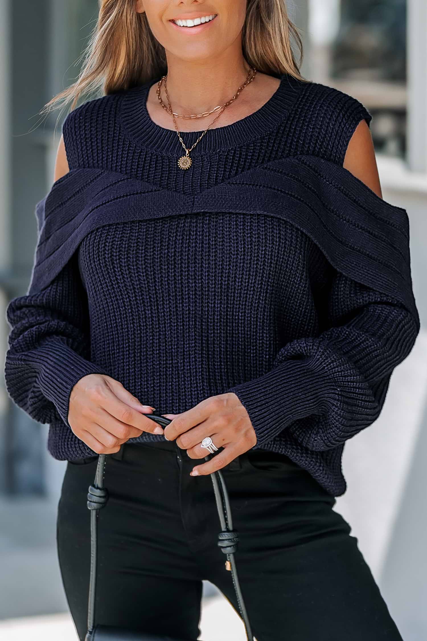 Blue Round Neck Cutout Shoulder Long Sleeve Sweater