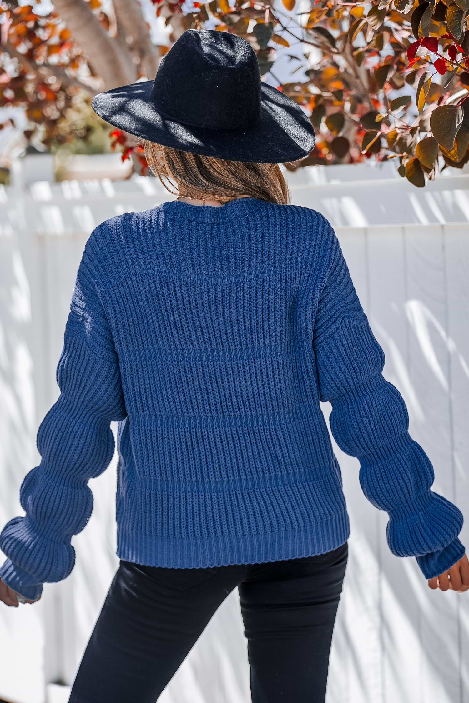 HomeBlue Round Neck Ornamental Puff Sleeve Sweater