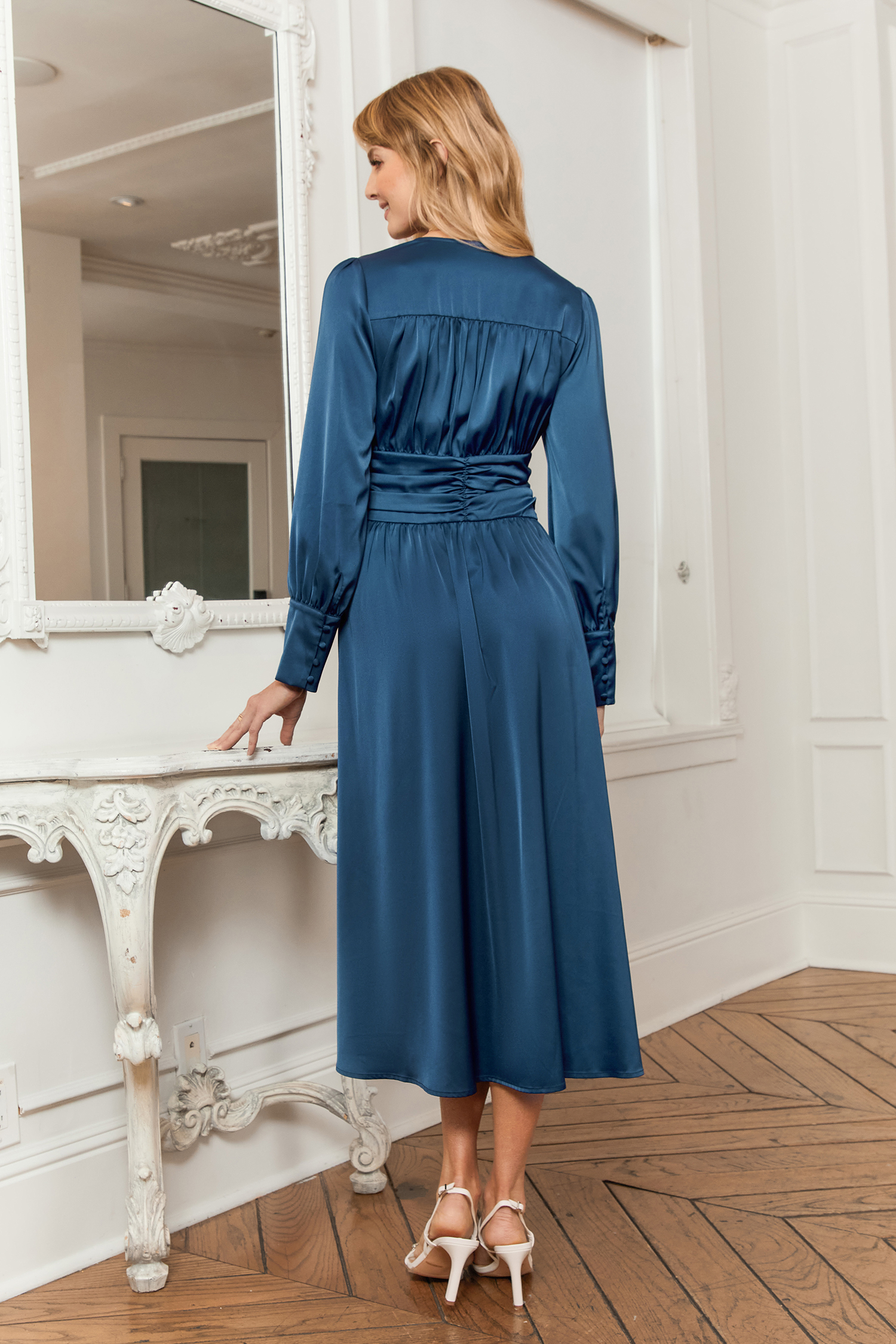 Blue Satin Plunging Long Sleeve Maxi Dress