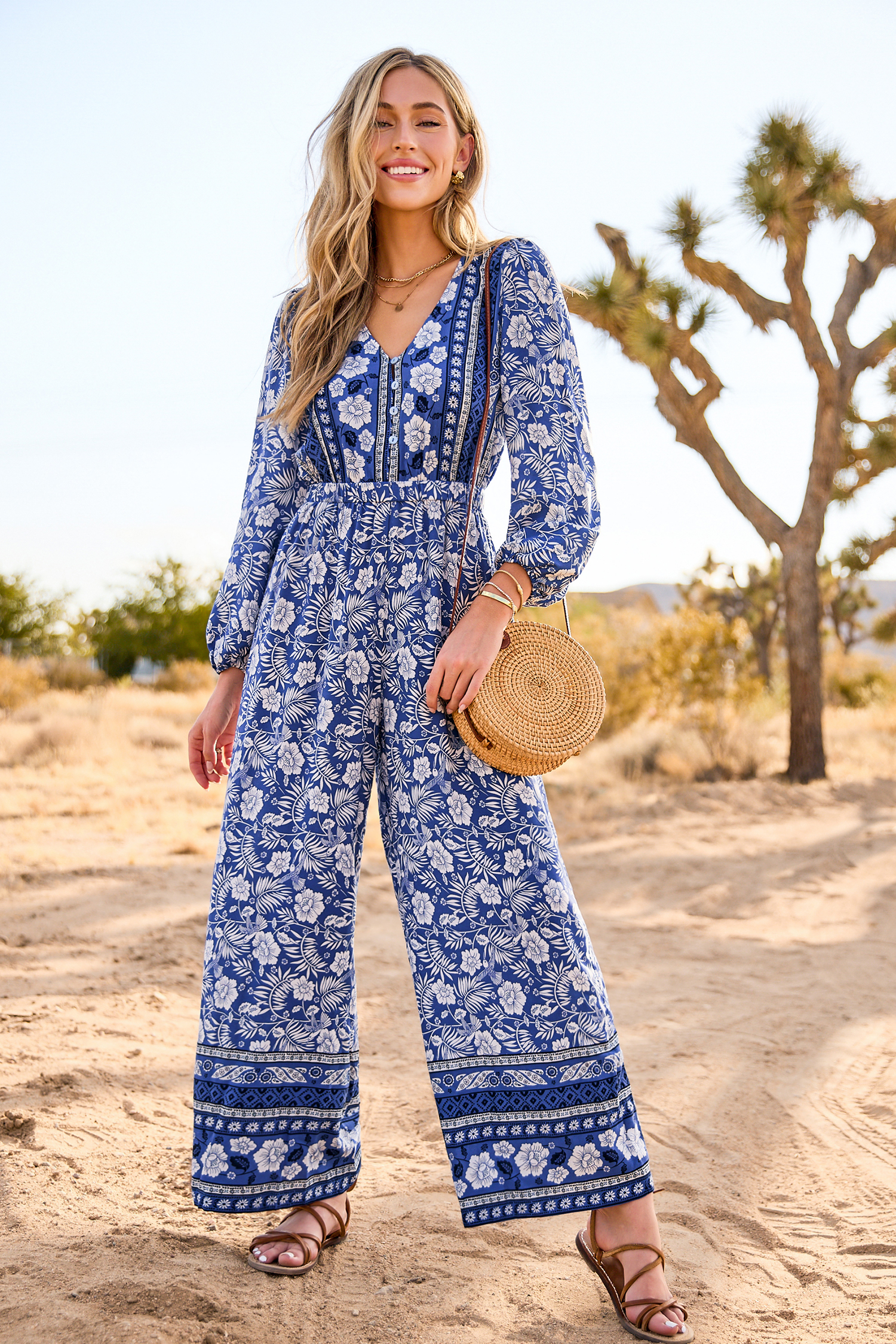 Blue & White Floral Long Sleeve Wide Leg Jumpsuit