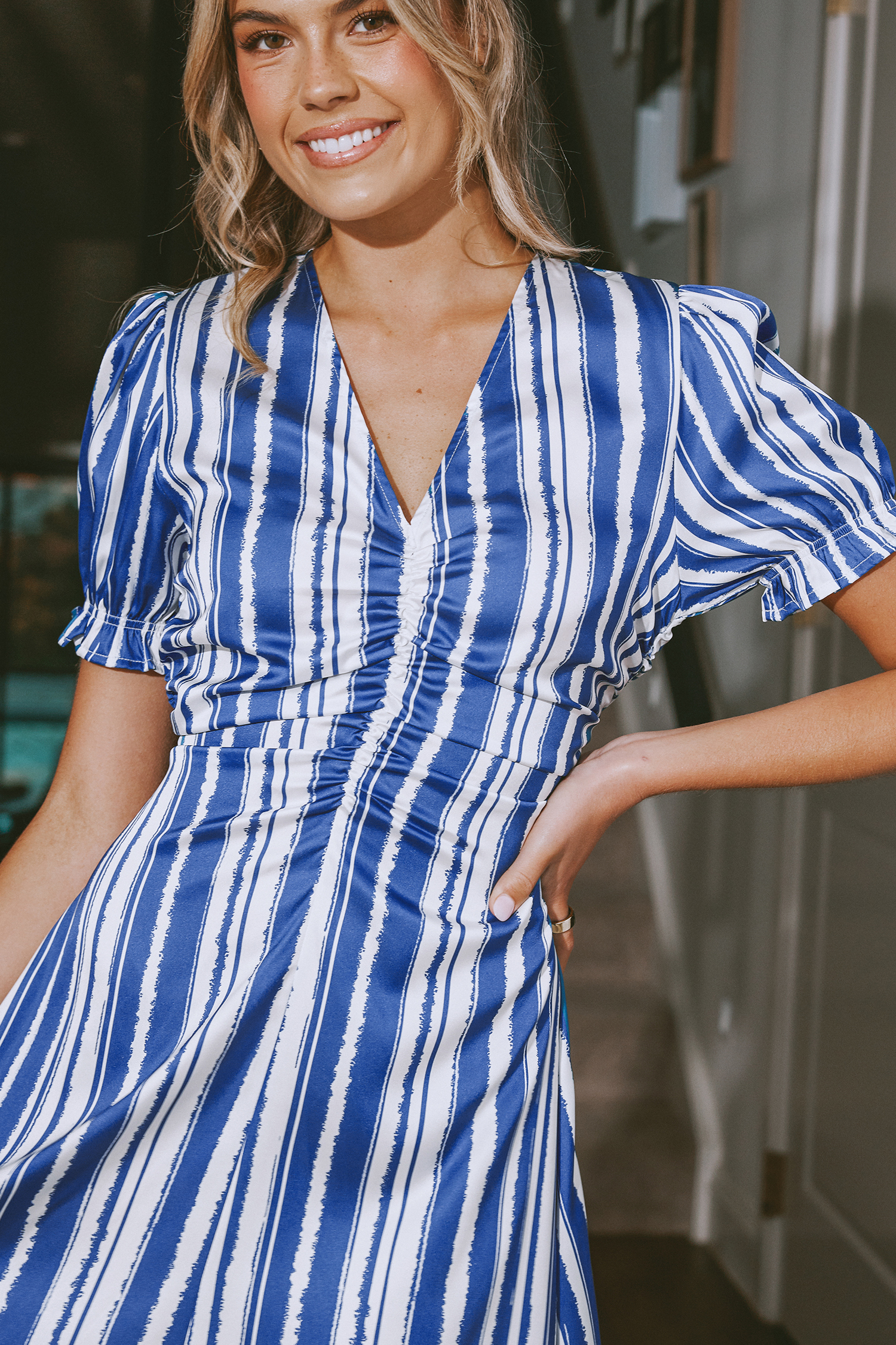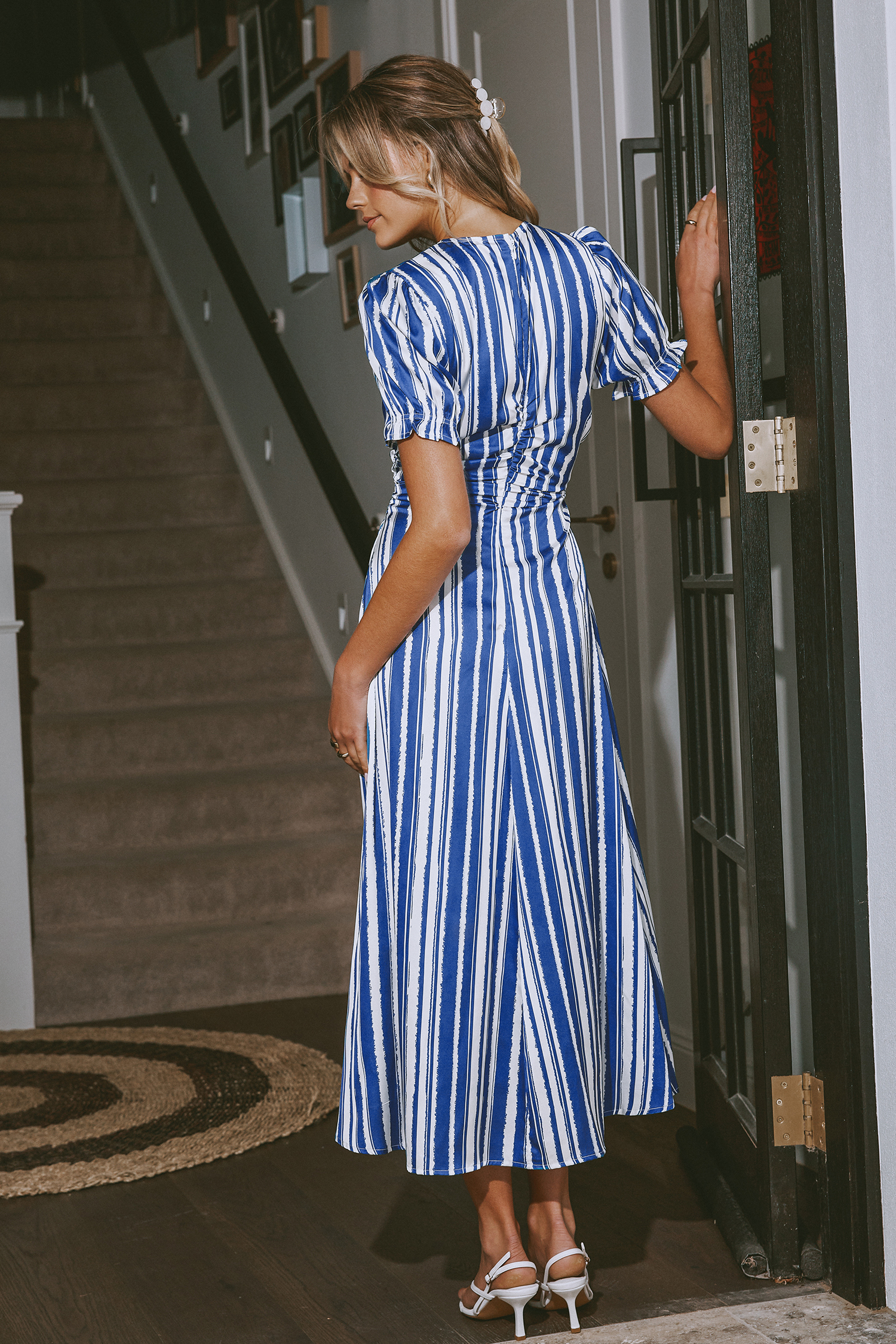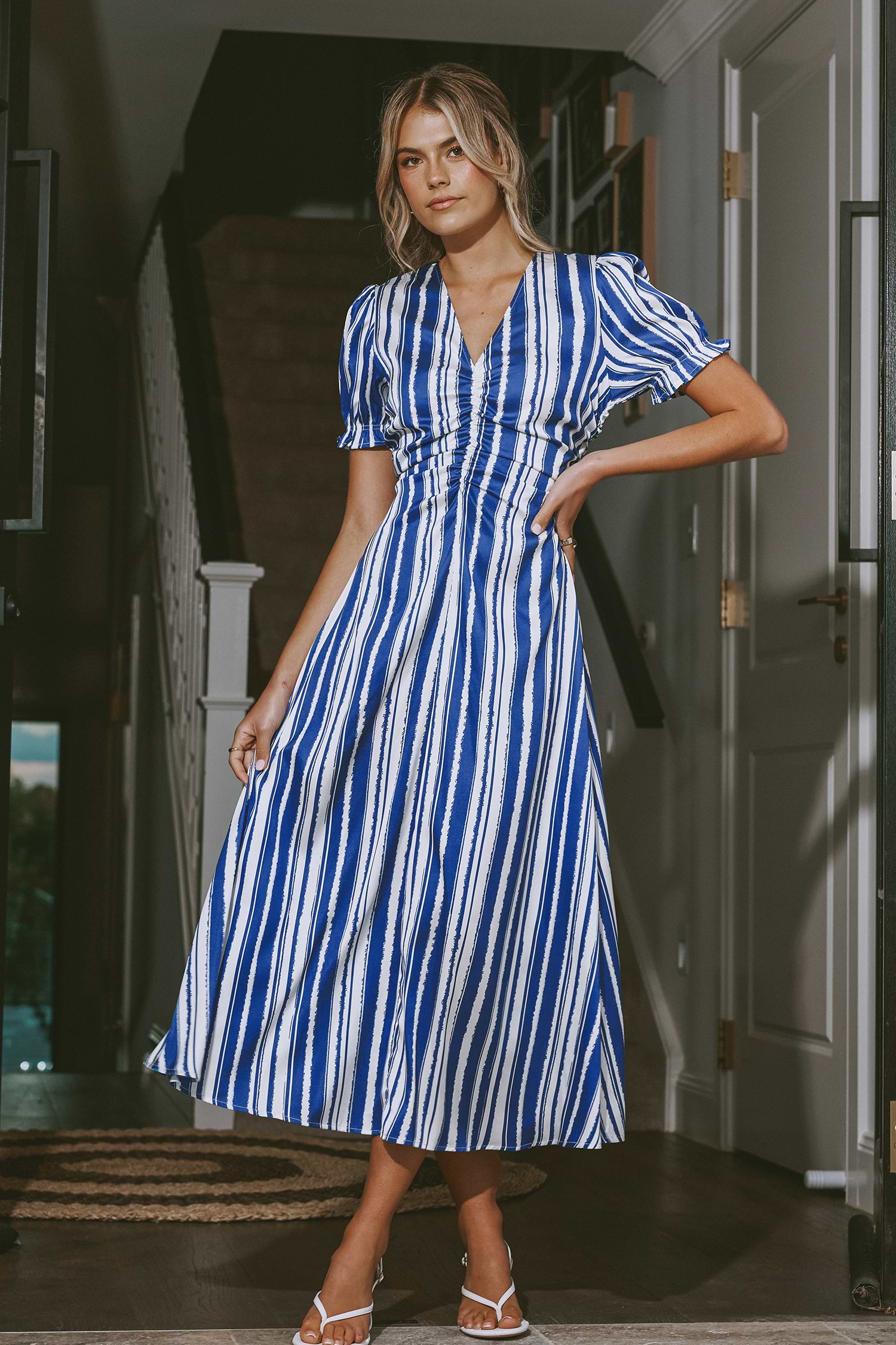 Blue & White Stripe Puff Sleeve V-Neck Midi Dress