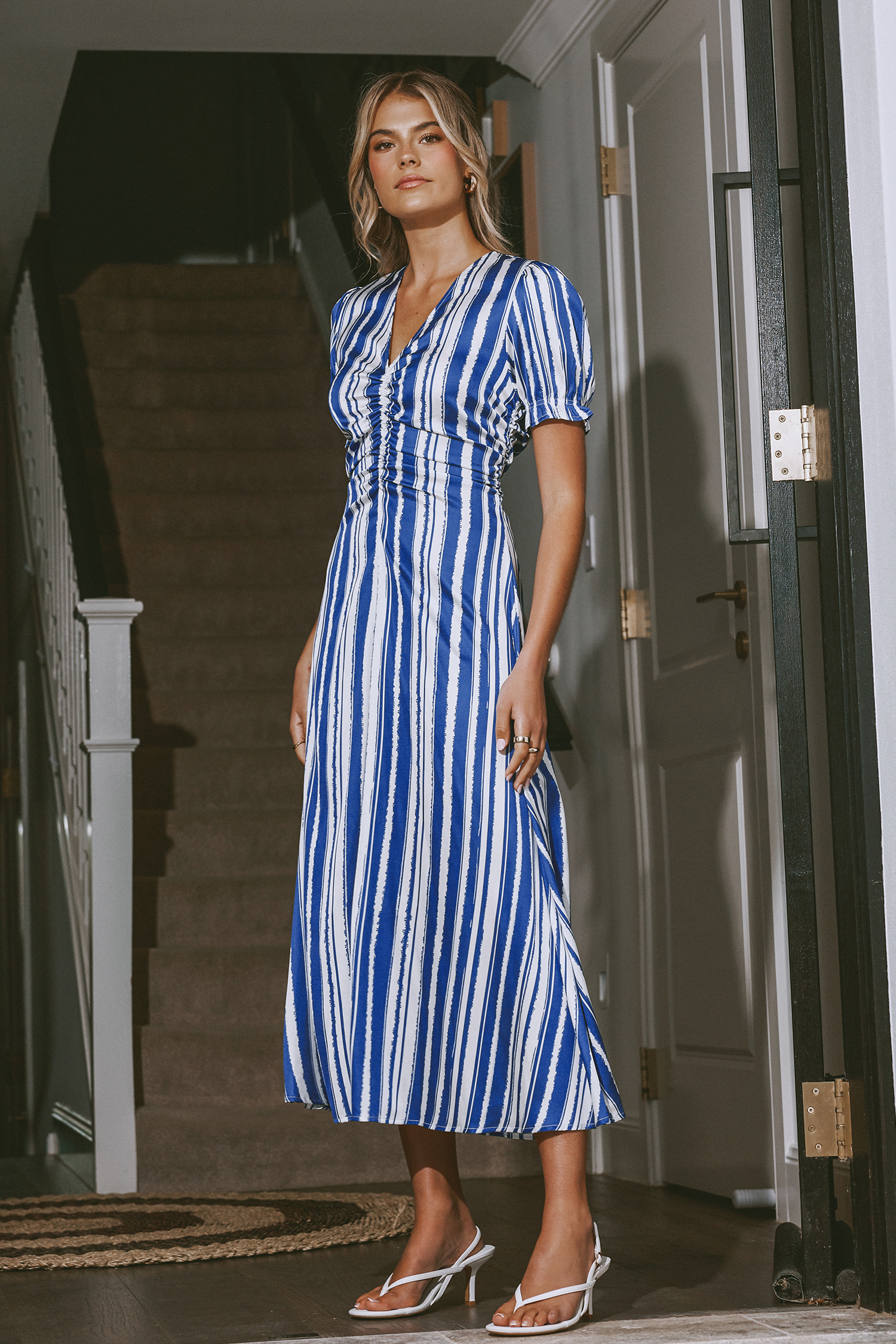HomeBlue & White Stripe Puff Sleeve V-Neck Midi Dress
