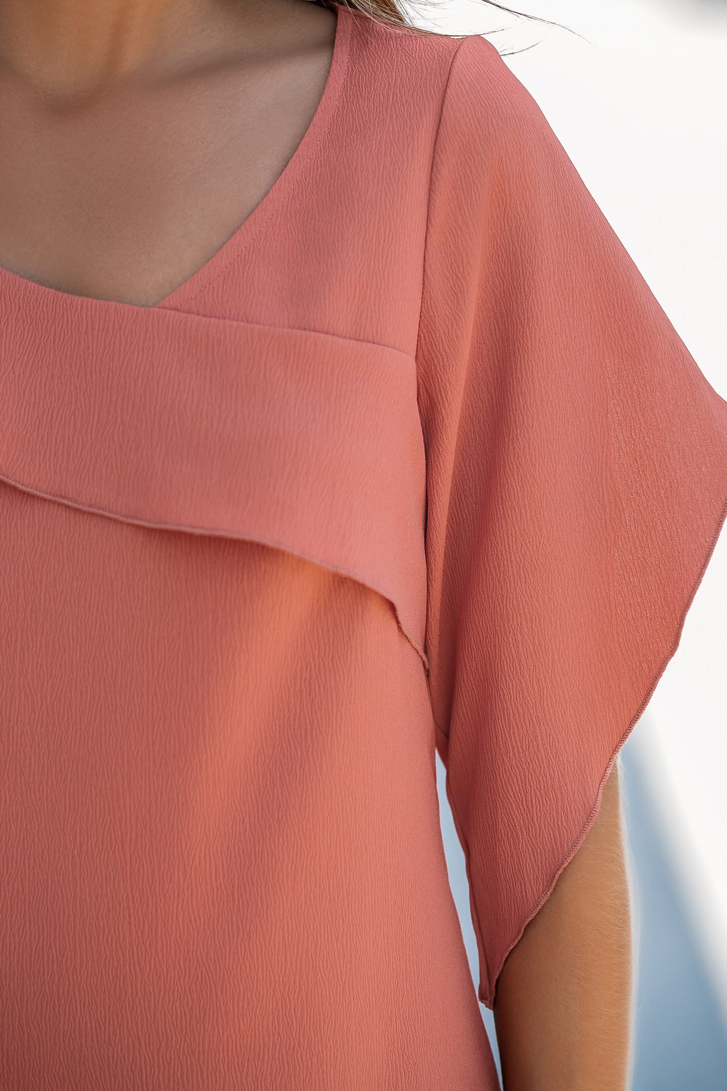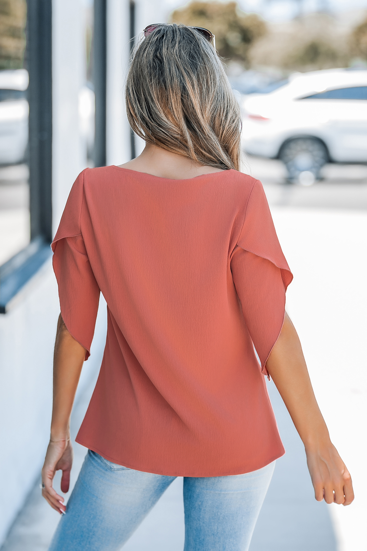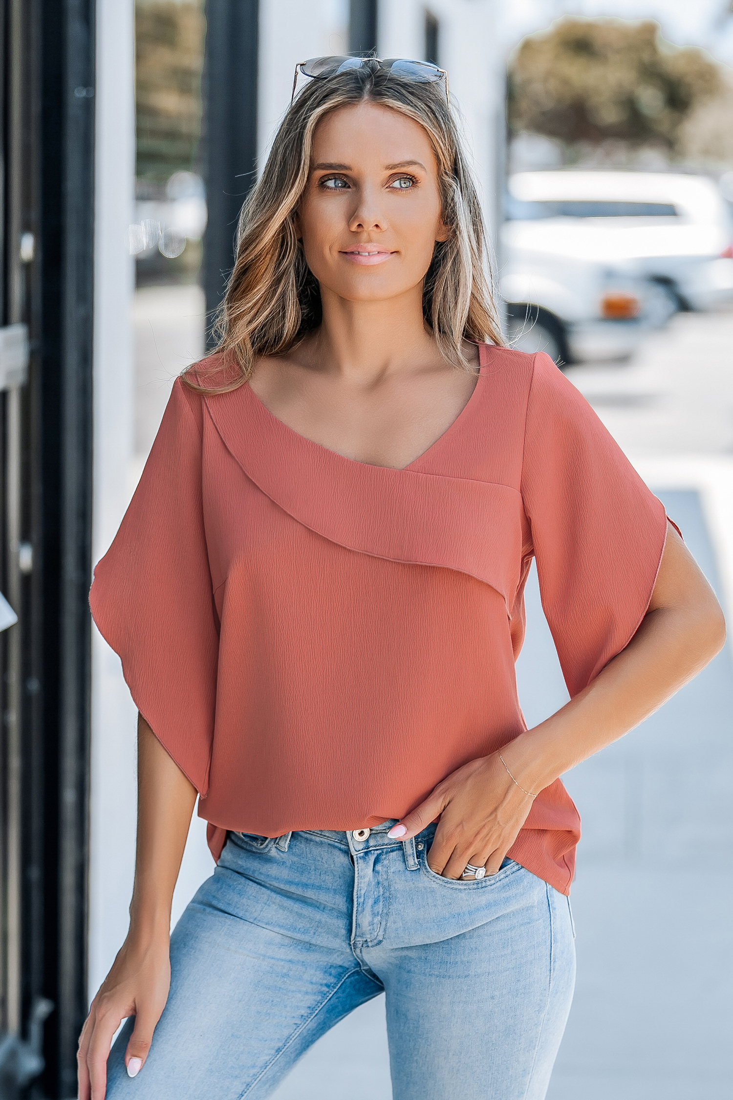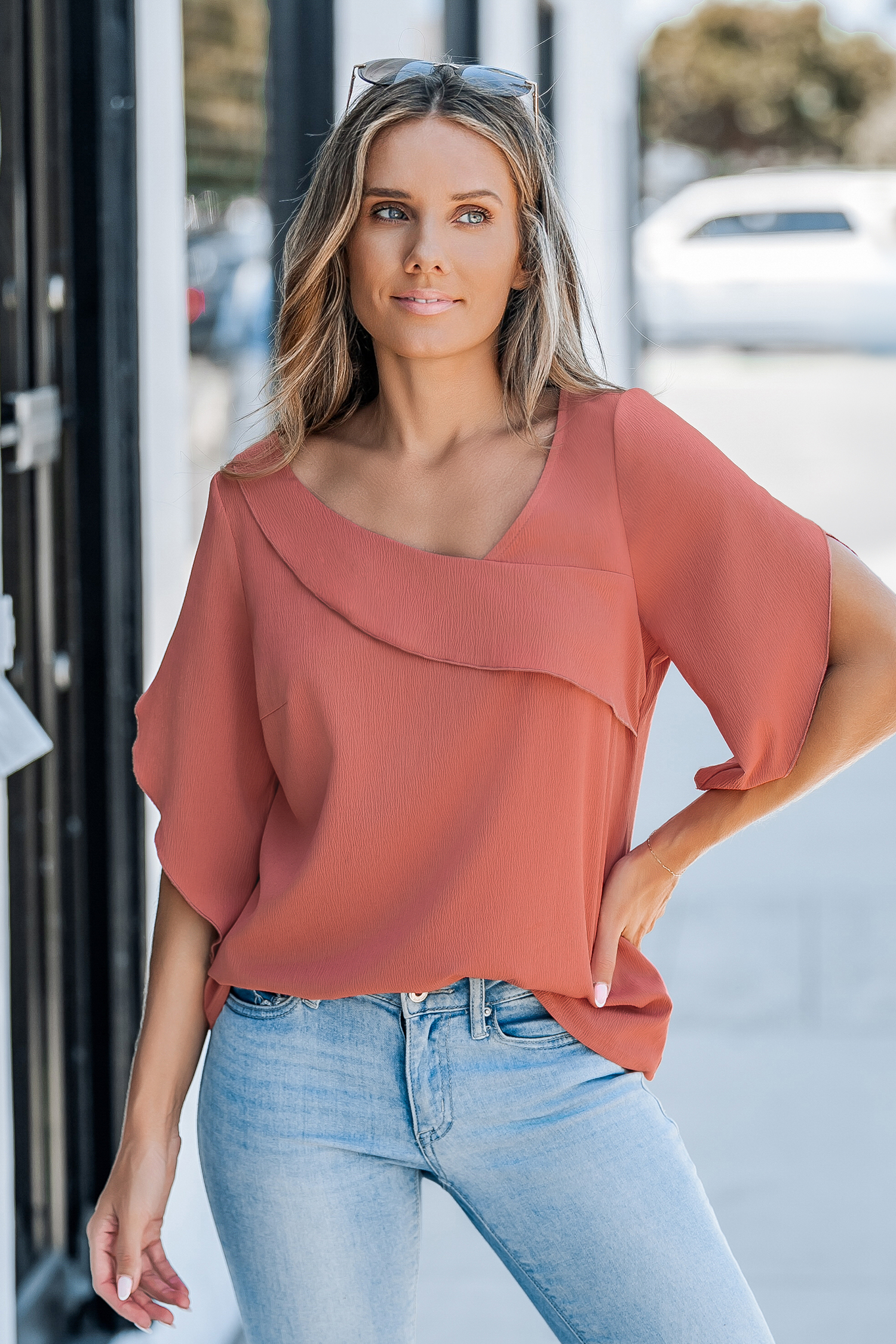Brick Red Asymmetric Ruffle Short Sleeve Blouse