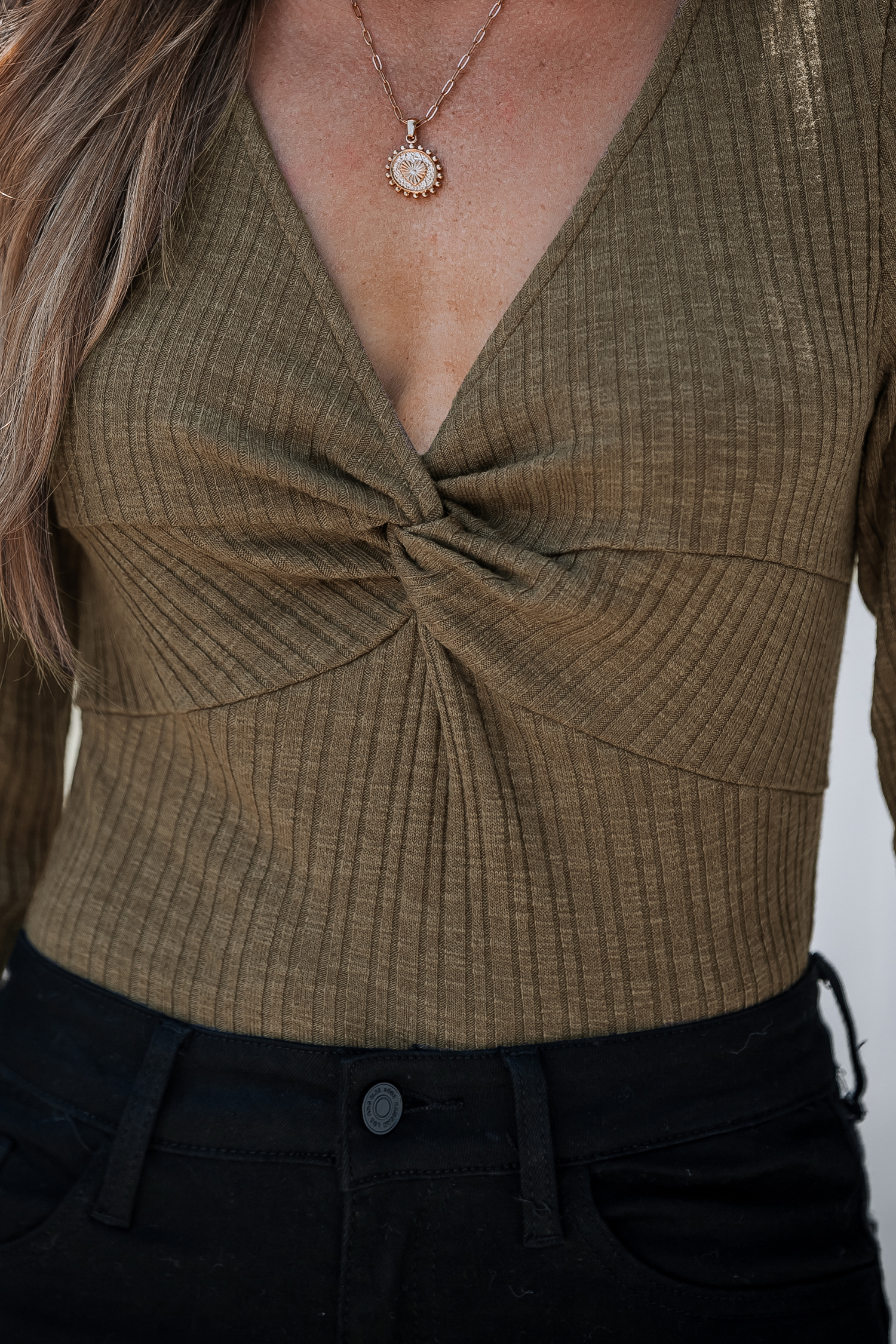 Brown Ribbed Knit Plunging Twist Bodysuit