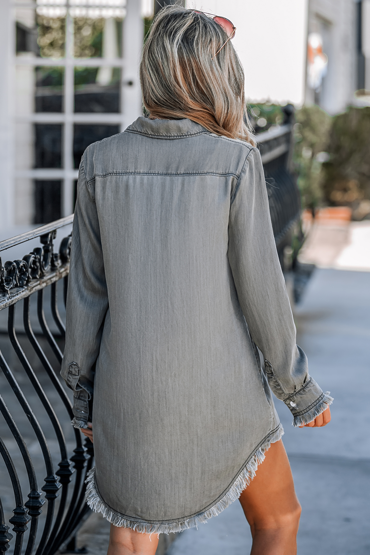 Button-Front Frayed Longline Denim Shirt