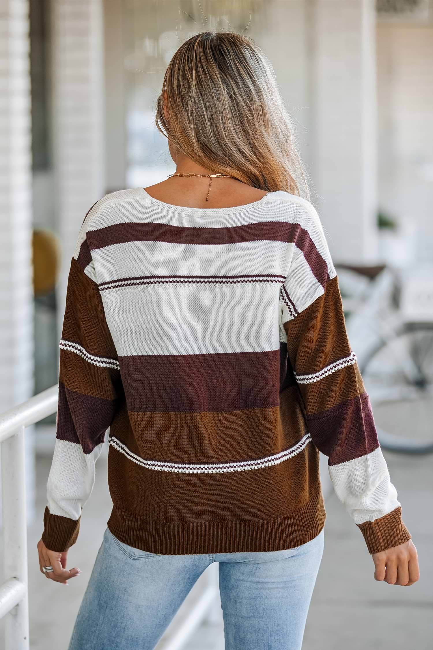 Coffee Striped V-Neck Sweater