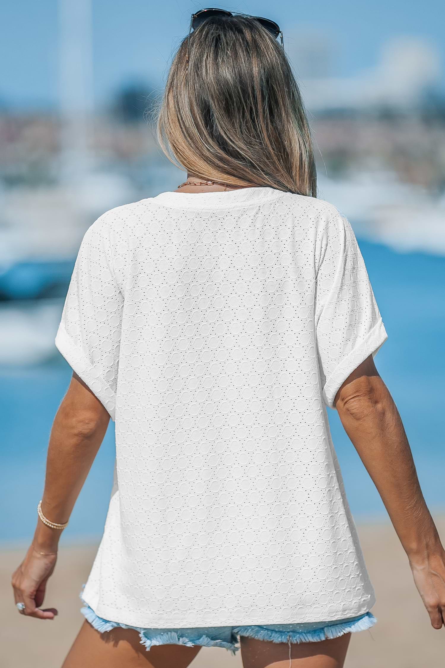 Make a statement with our Cutout Textured V-Neck Tee. This trendy tee features eye-catching cutout details and a textured fabric for added dimension, perfect for adding a touch of edge to your casual outfits.