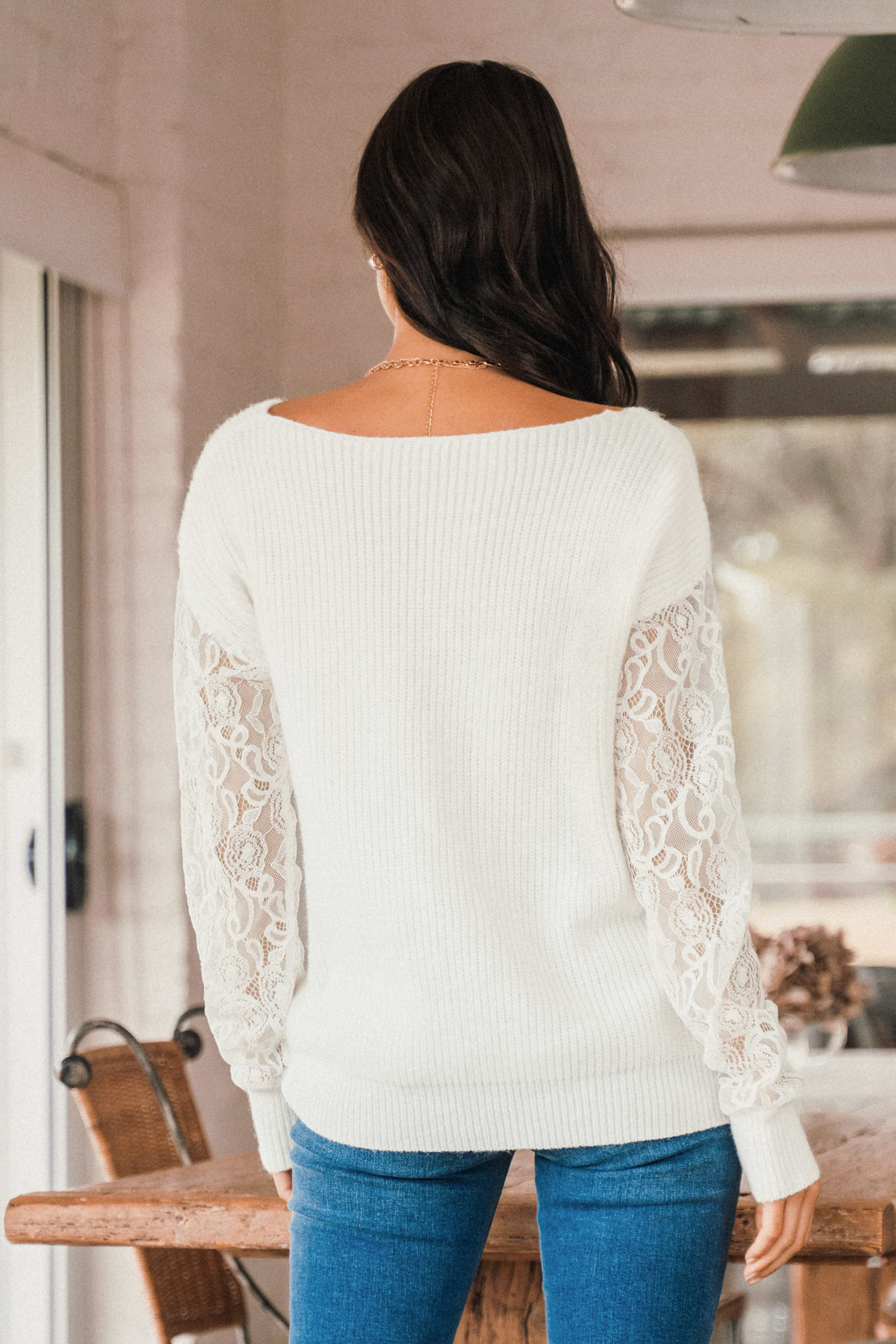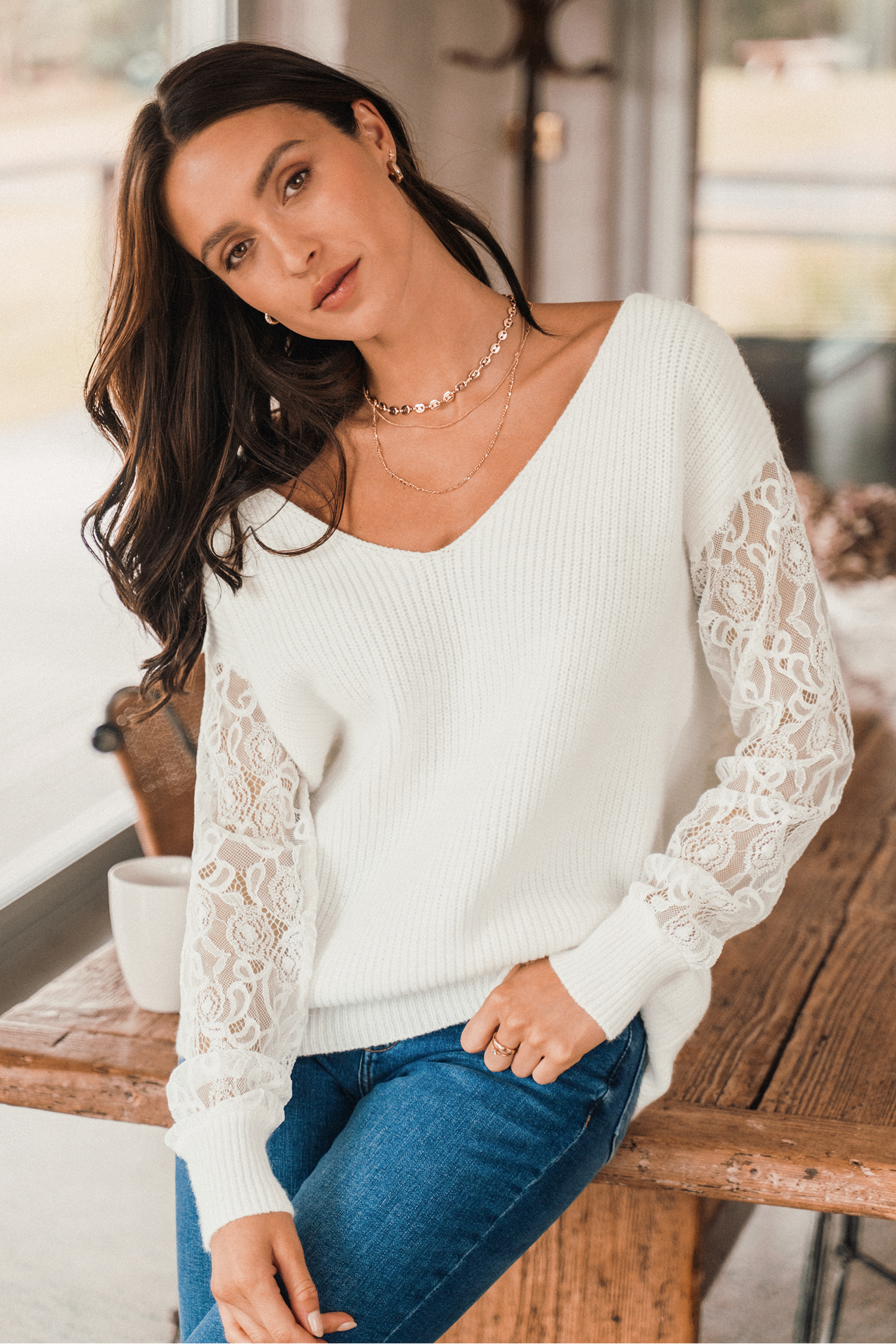 HomeFloral Lace Sleeve Rib V-Neck Sweater