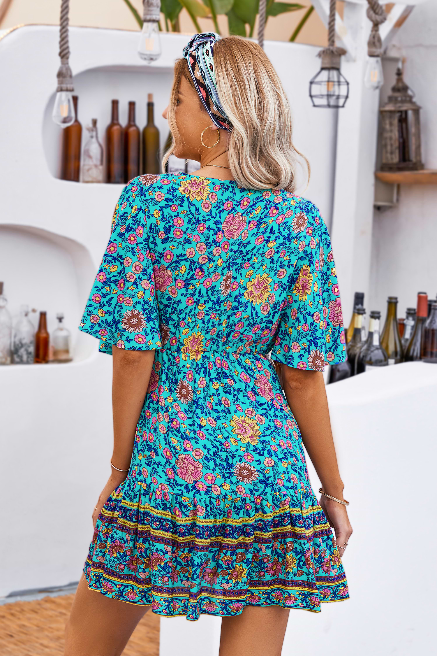 HomeGertie Elastic Waist V-Neck Boho A-Shape Dress