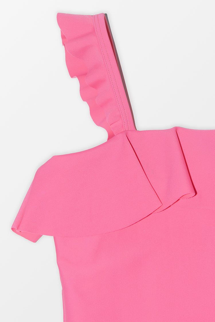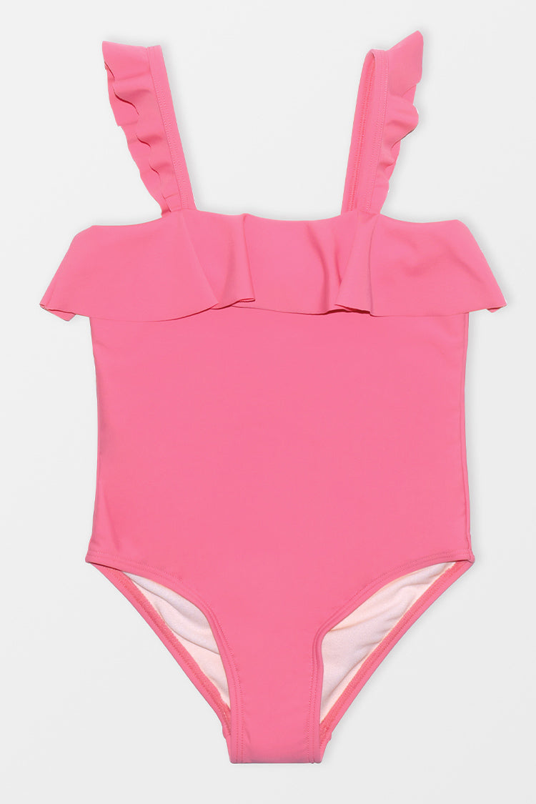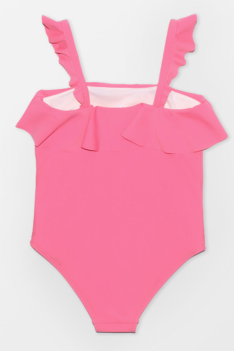 Girls' Joyful Retro Solid Ruffled Pink One Piece Swimsuit
