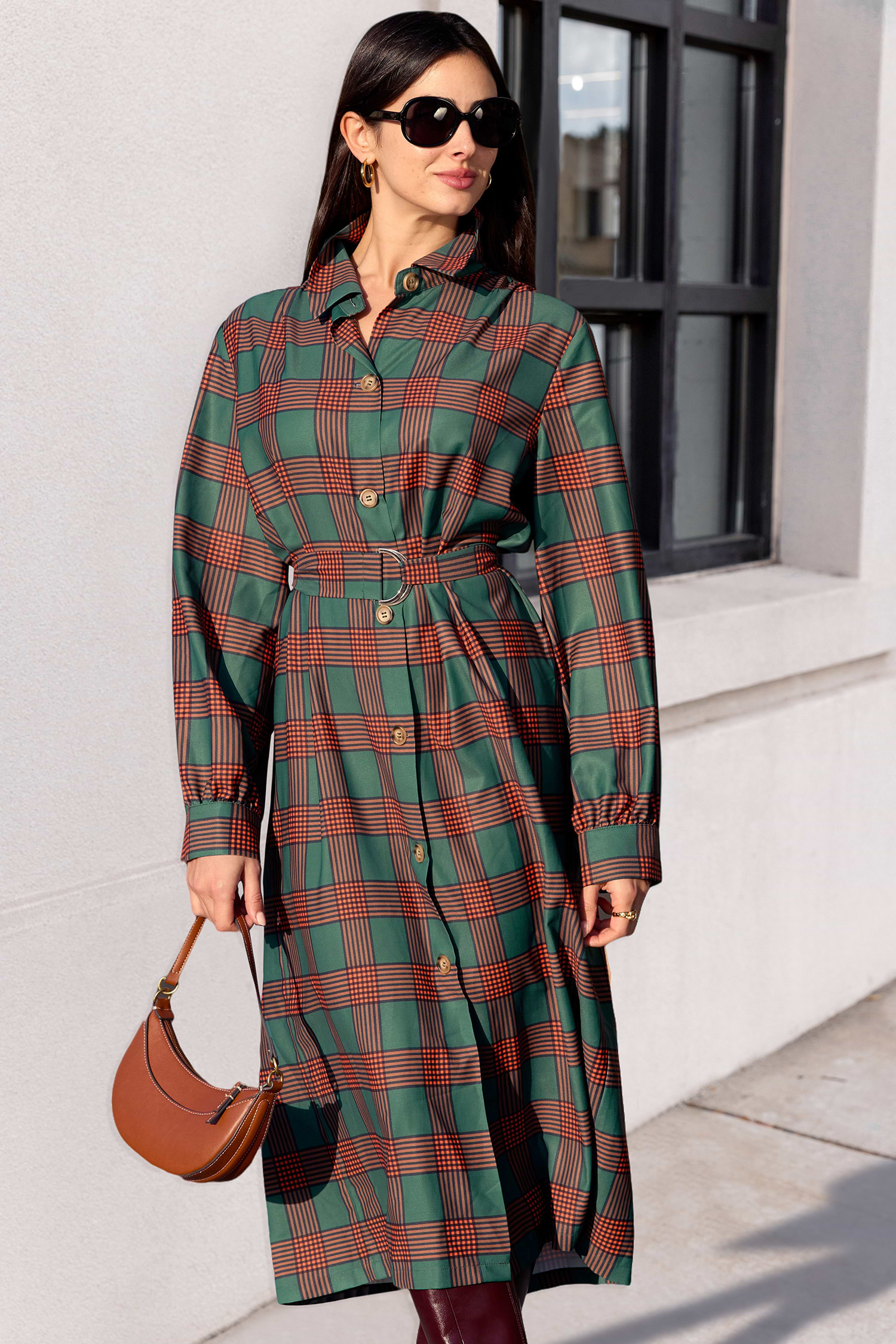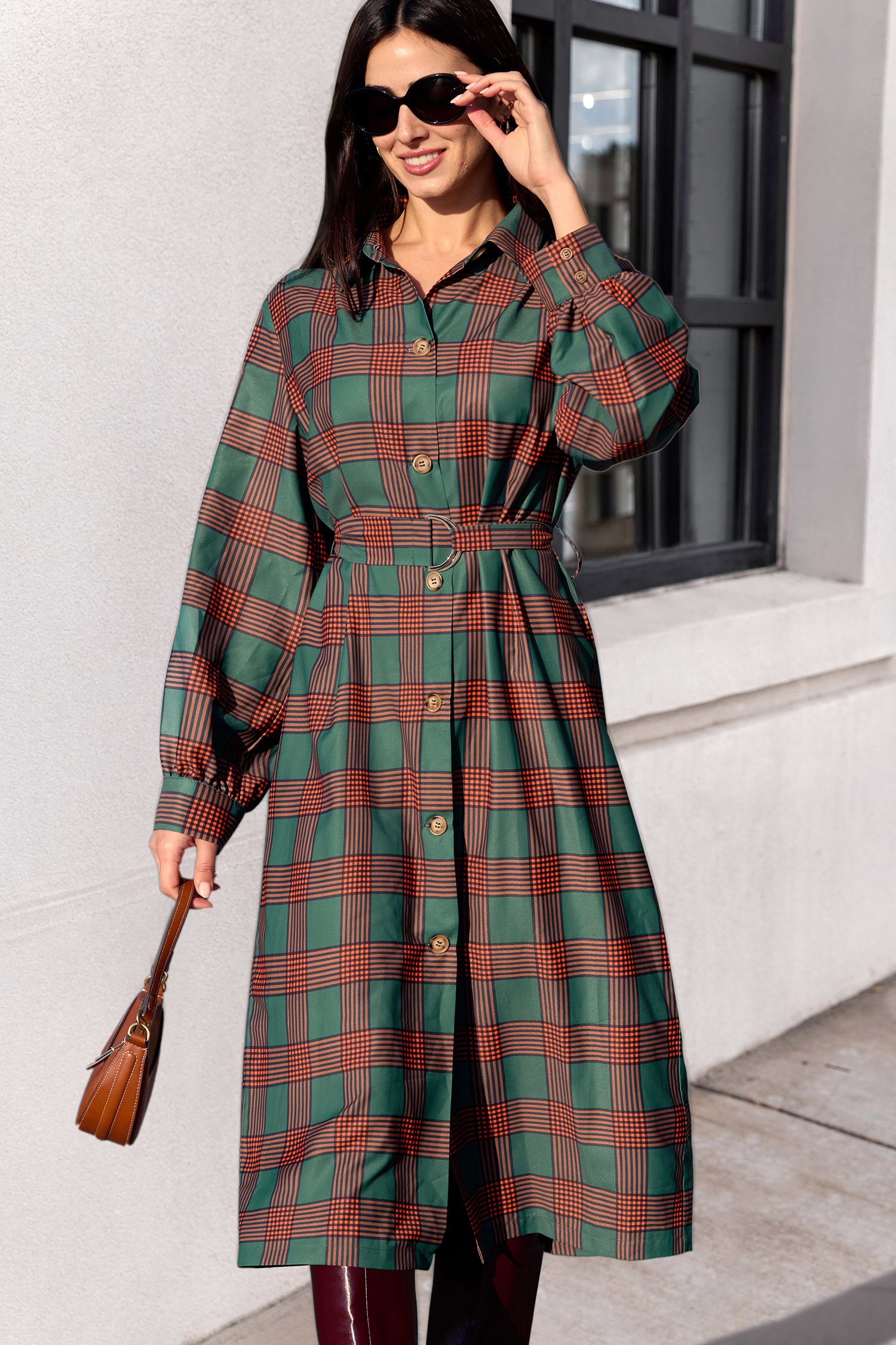 Green & Orange Plaid Collared Long Sleeve Shirt Dress