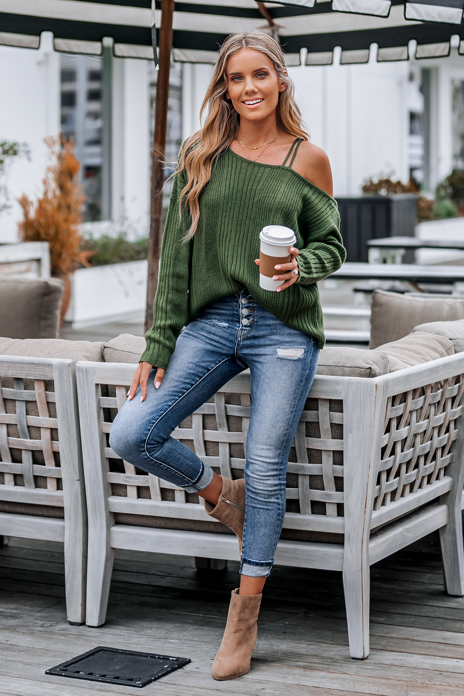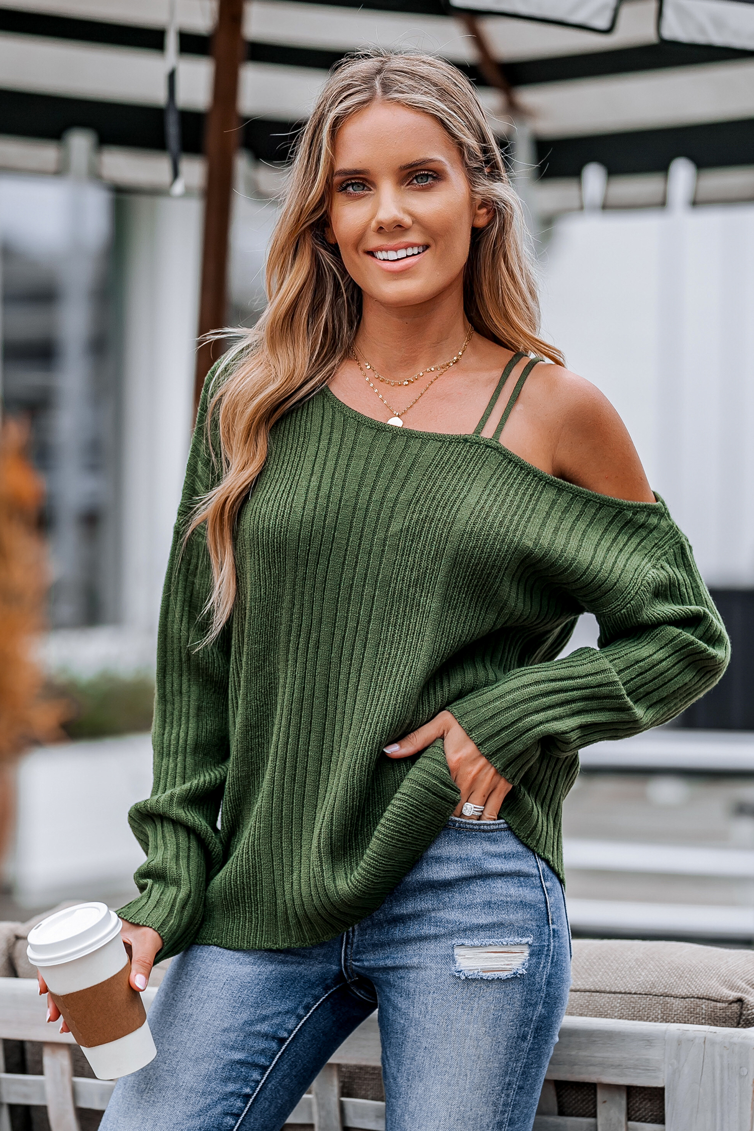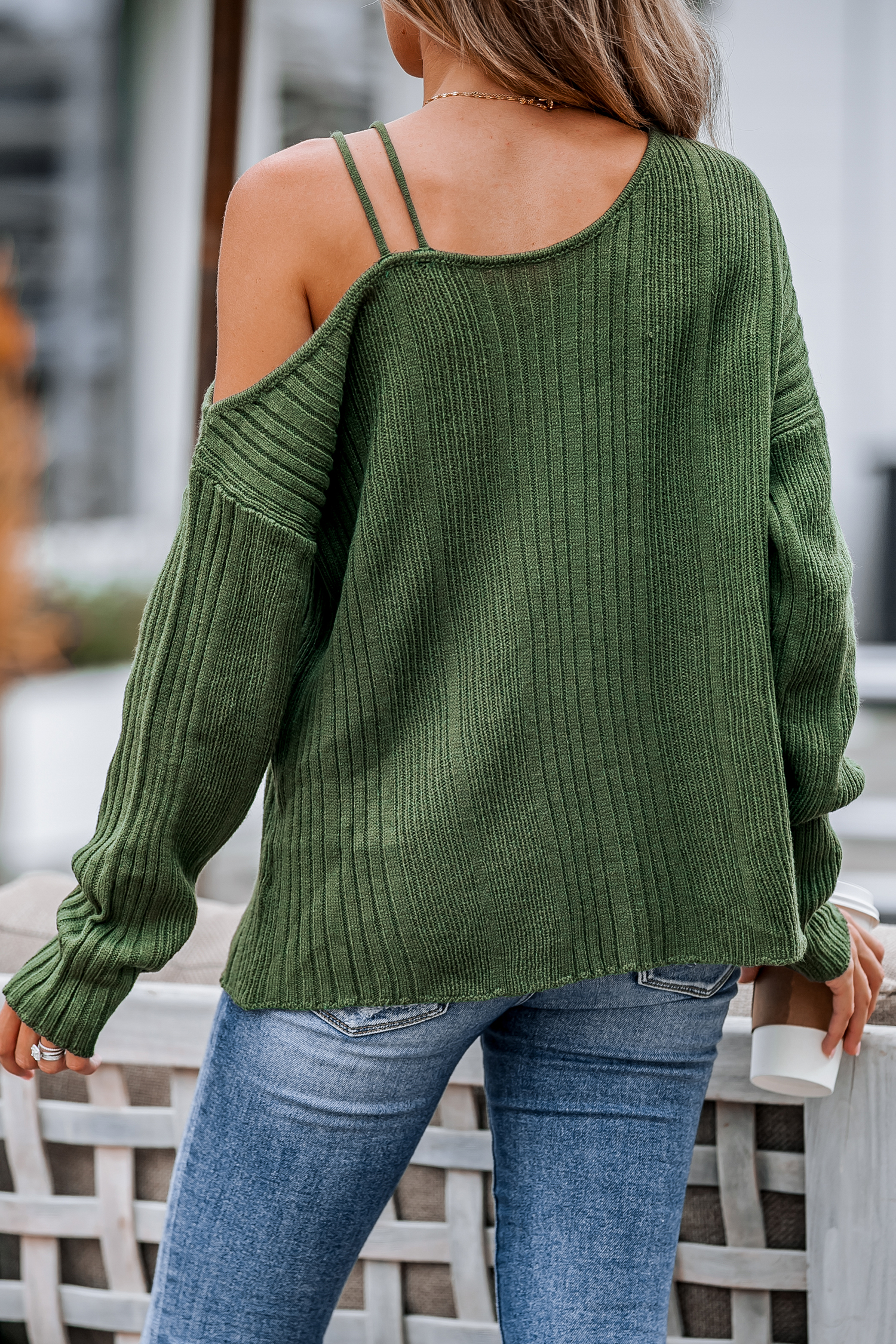 Green Rib One-Shoulder Sweater