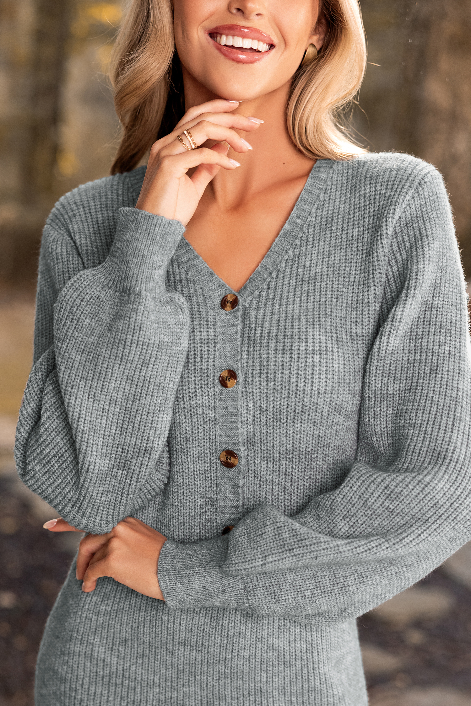 Grey V-Neck Long Puff Sleeve Mini Sweater Dress