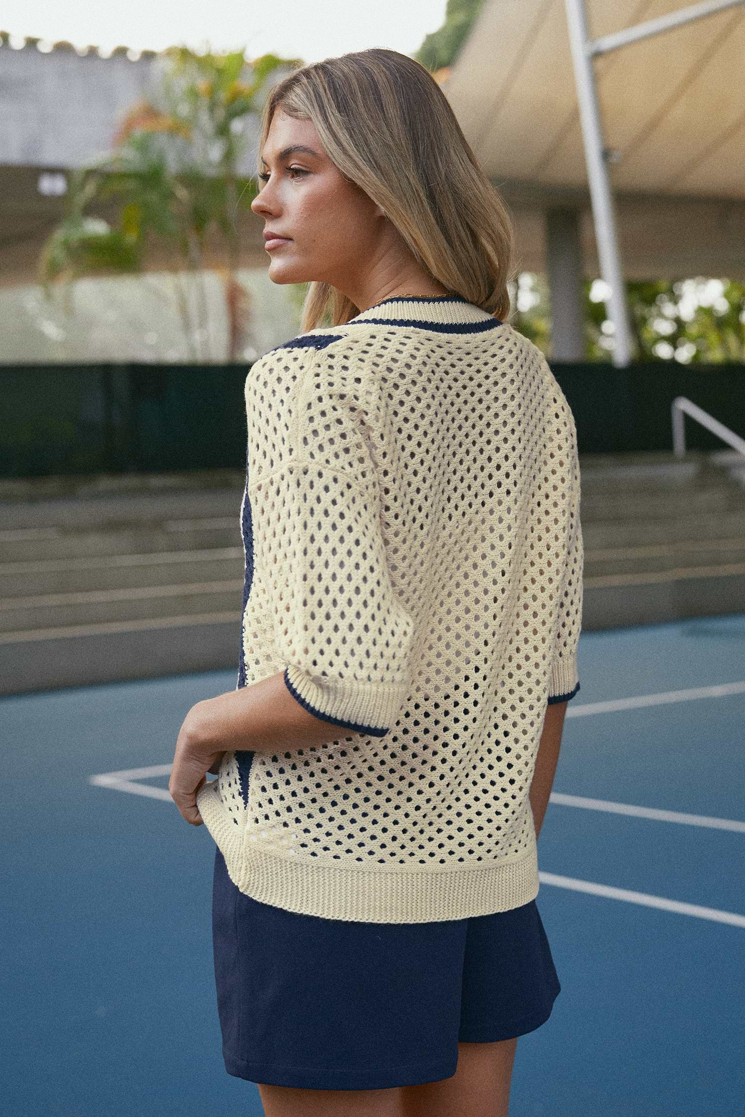 Neutral with a twist. The Khaki Colorblock Half Sleeve Open Knit Sweater features striking black contrast details, adding a bold touch to its relaxed design.