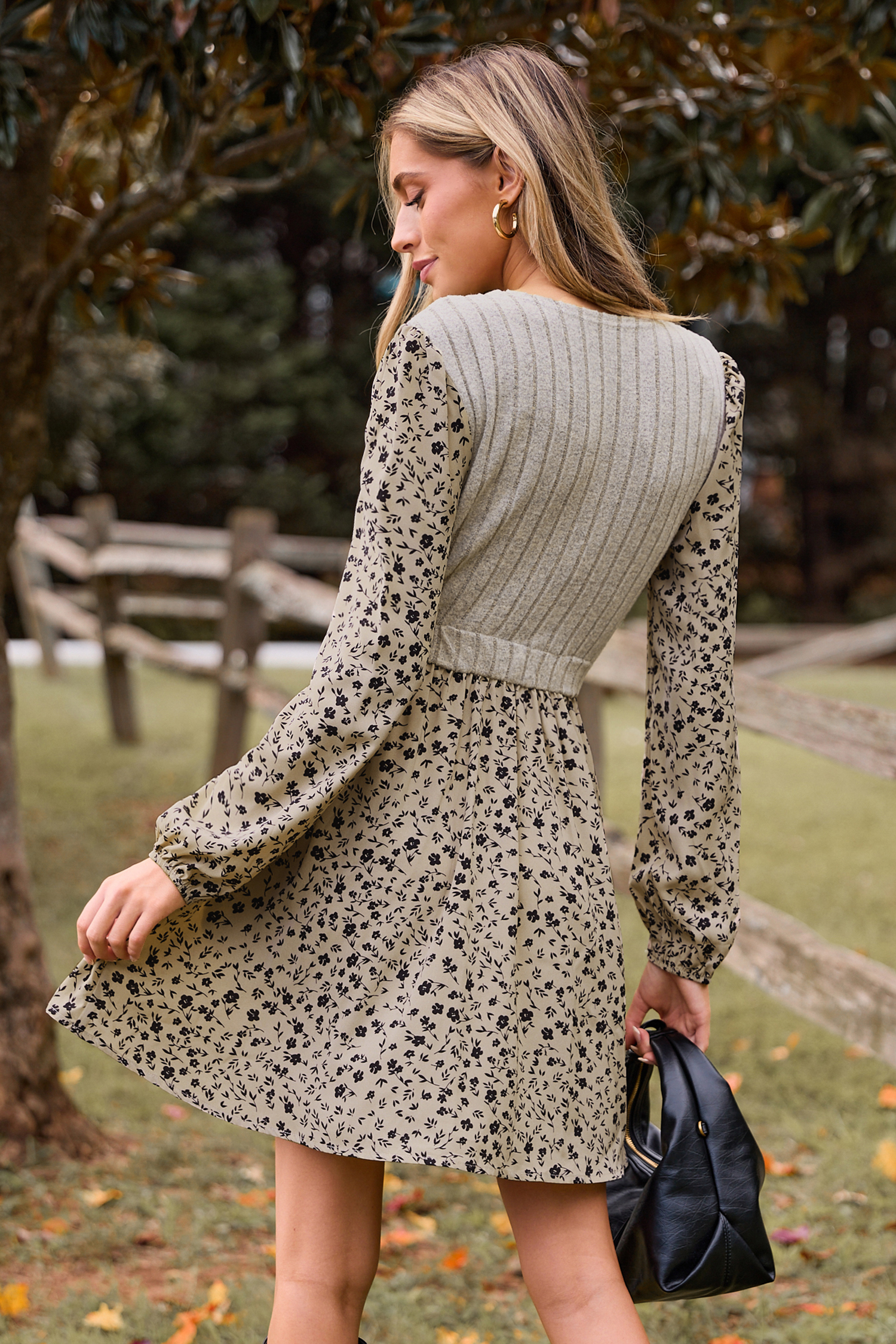 HomeKhaki Floral Round Neck Blouson Sleeve Mini Dress