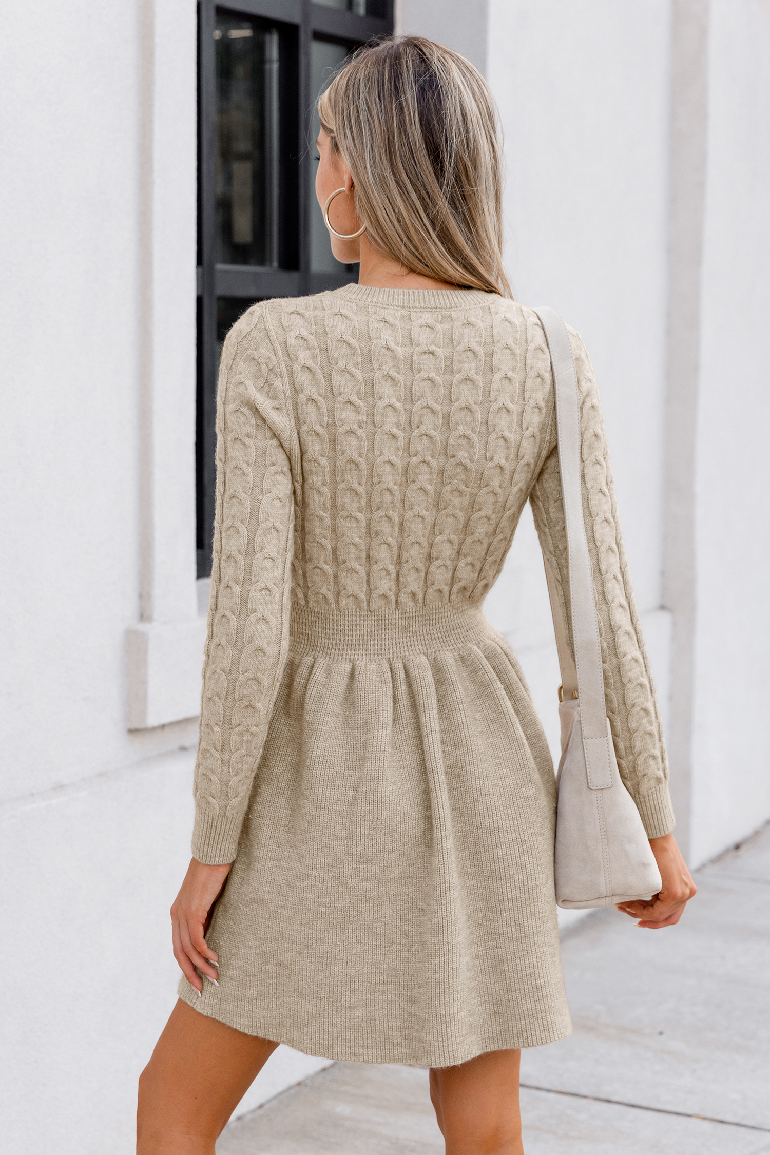HomeKhaki Round Neck Long Sleeve Knit Sweater Dress