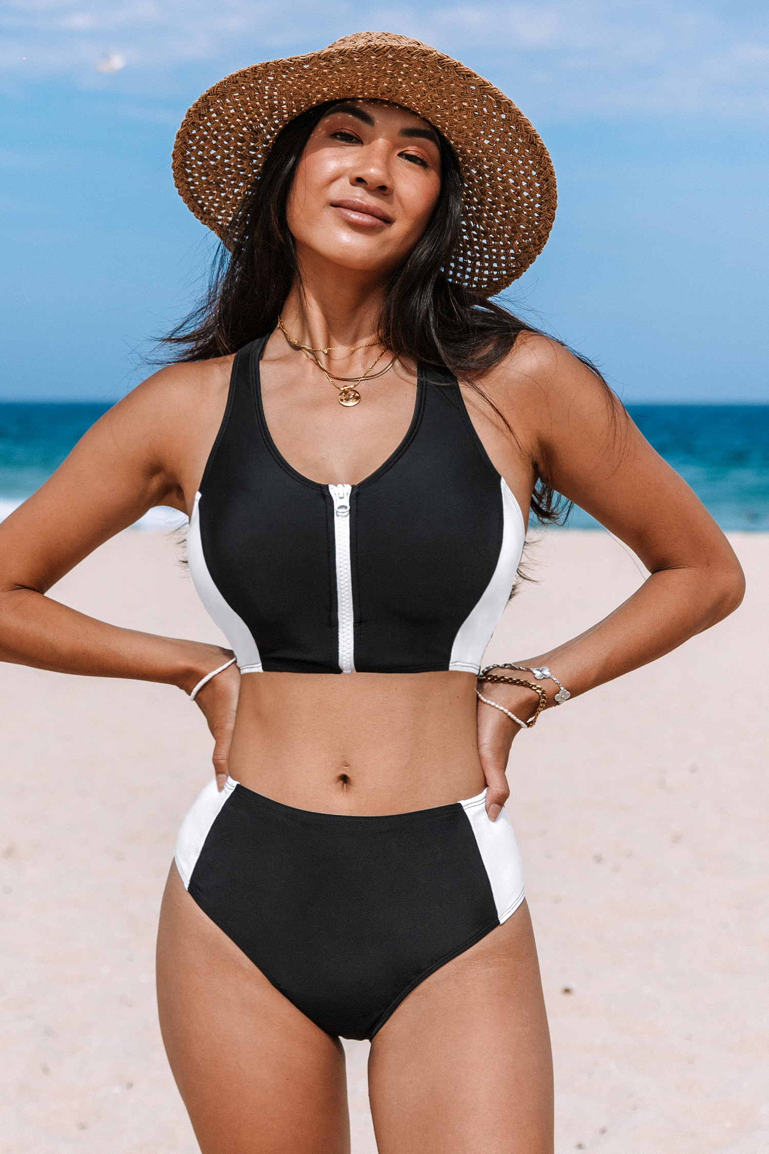 Lycra Sporty Zip-Front Bikini Bralette & High-Rise Bottoms Set