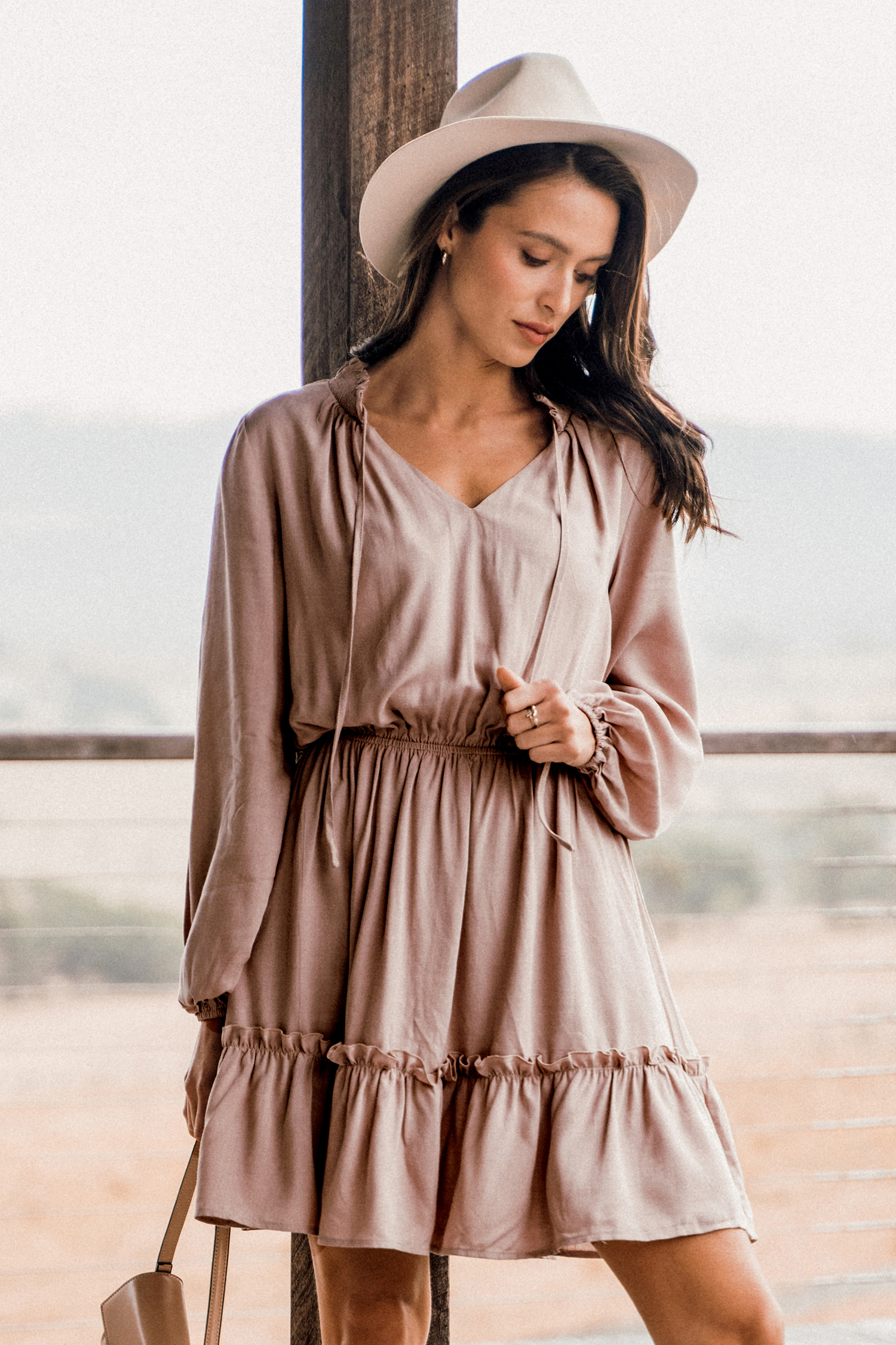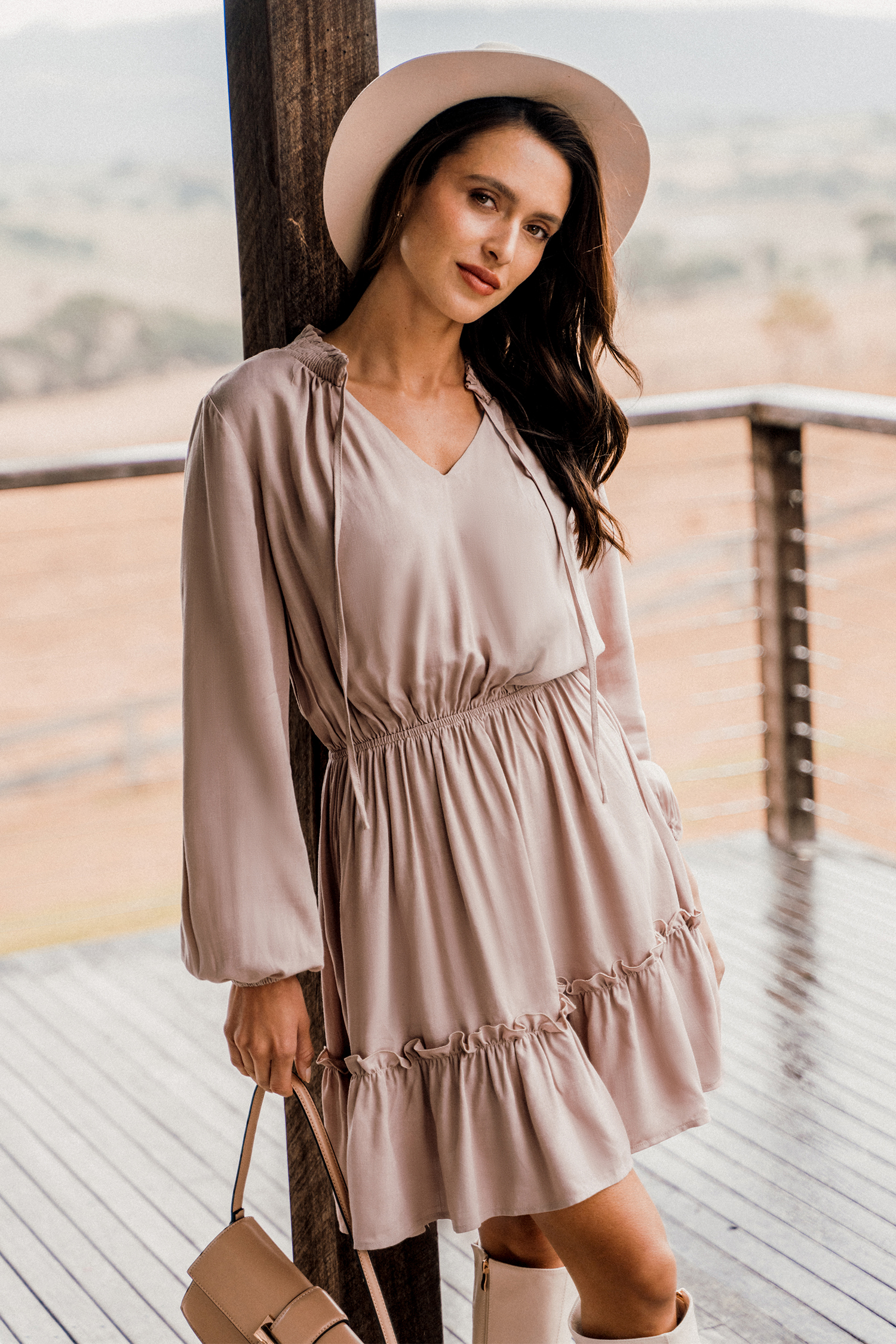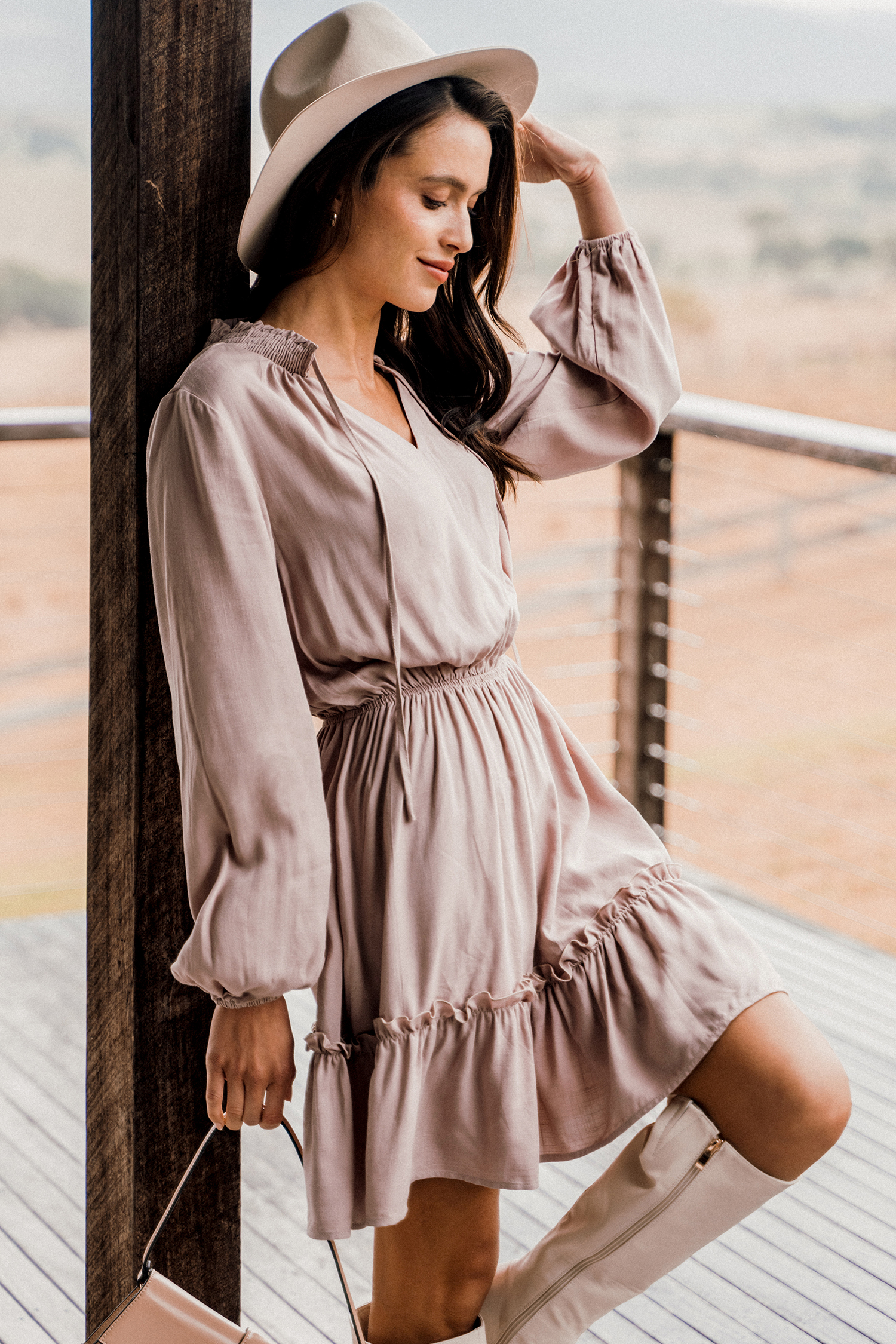 Mauve Ruffled Tie Neck A-Line MIni Dress