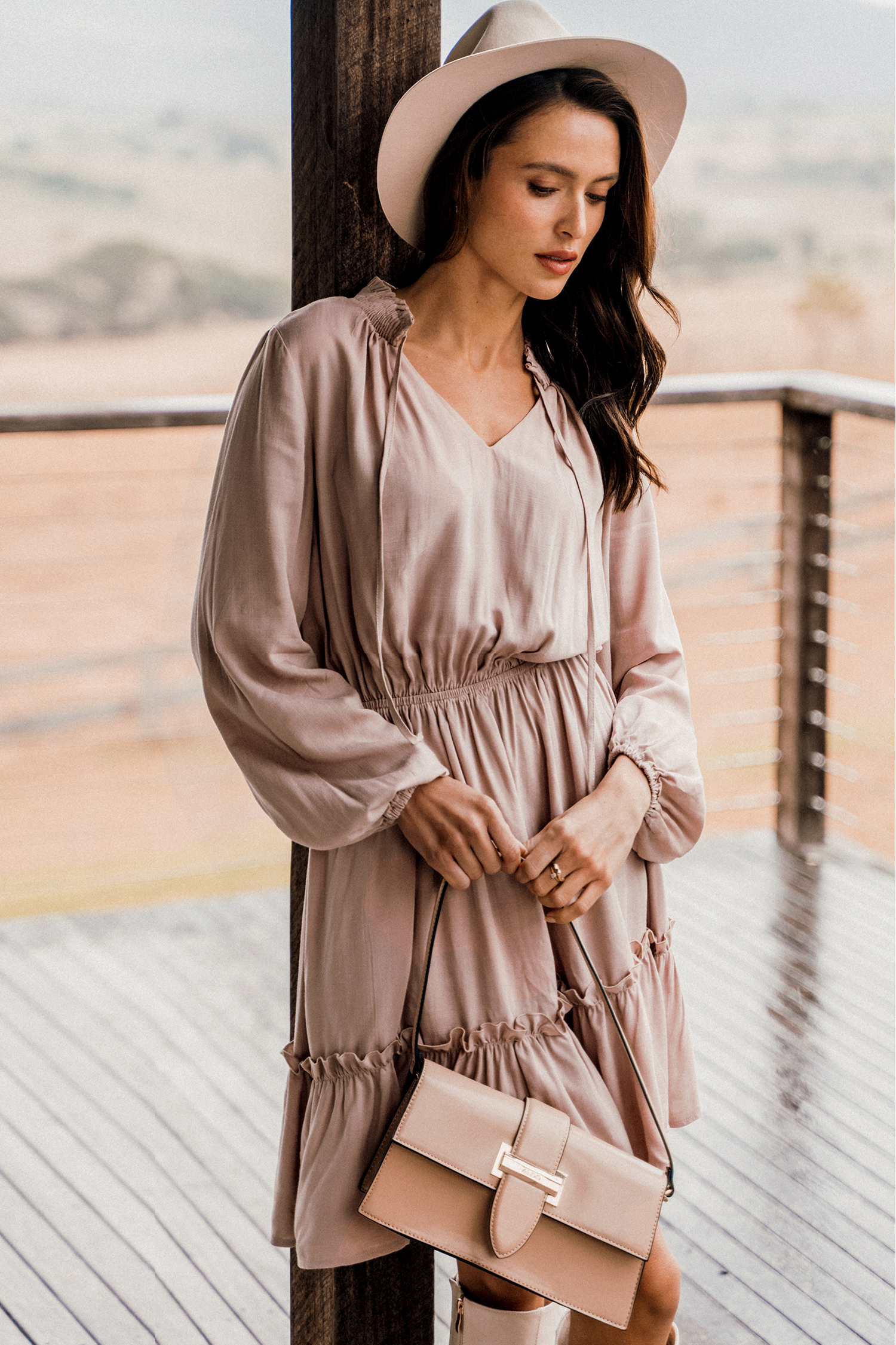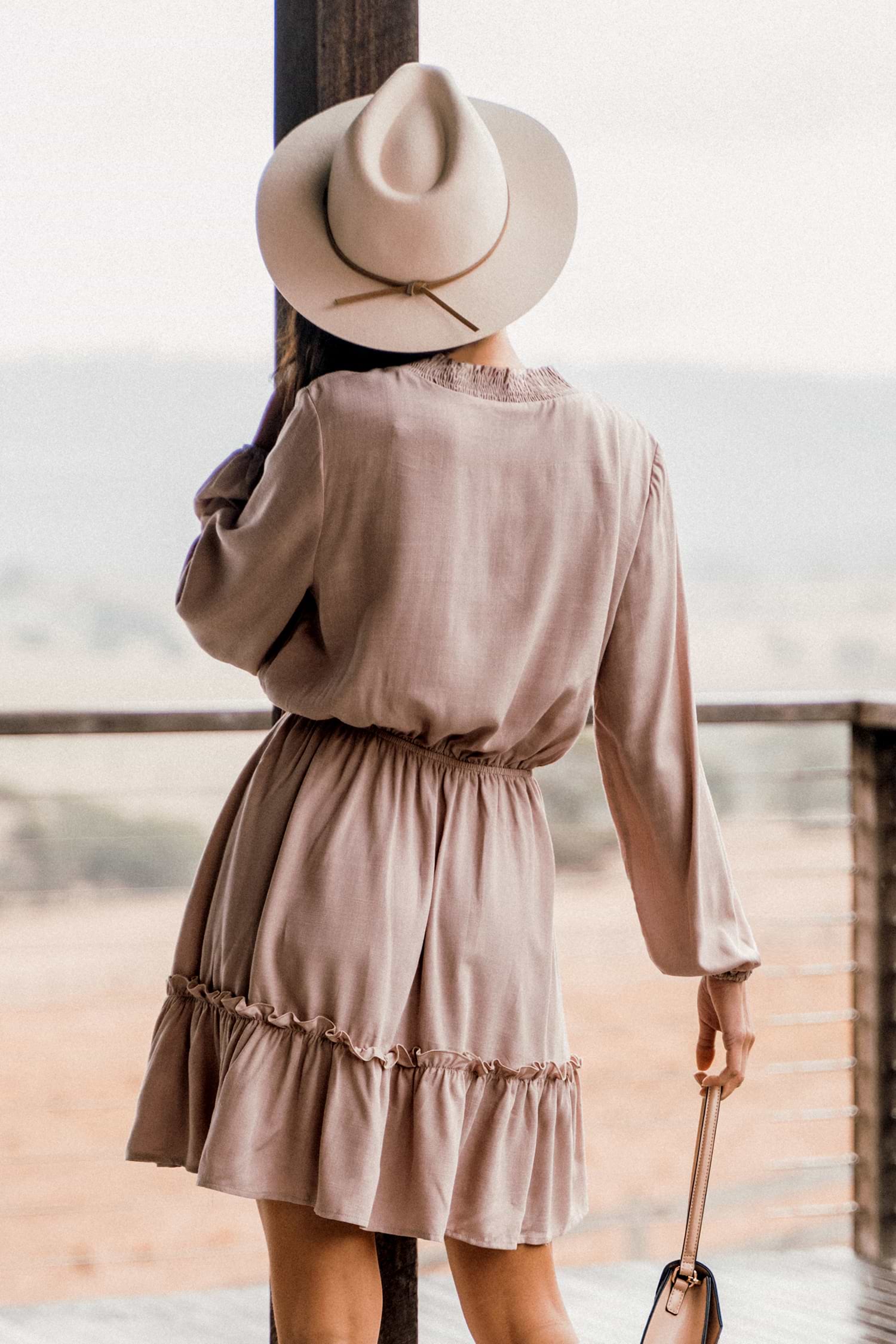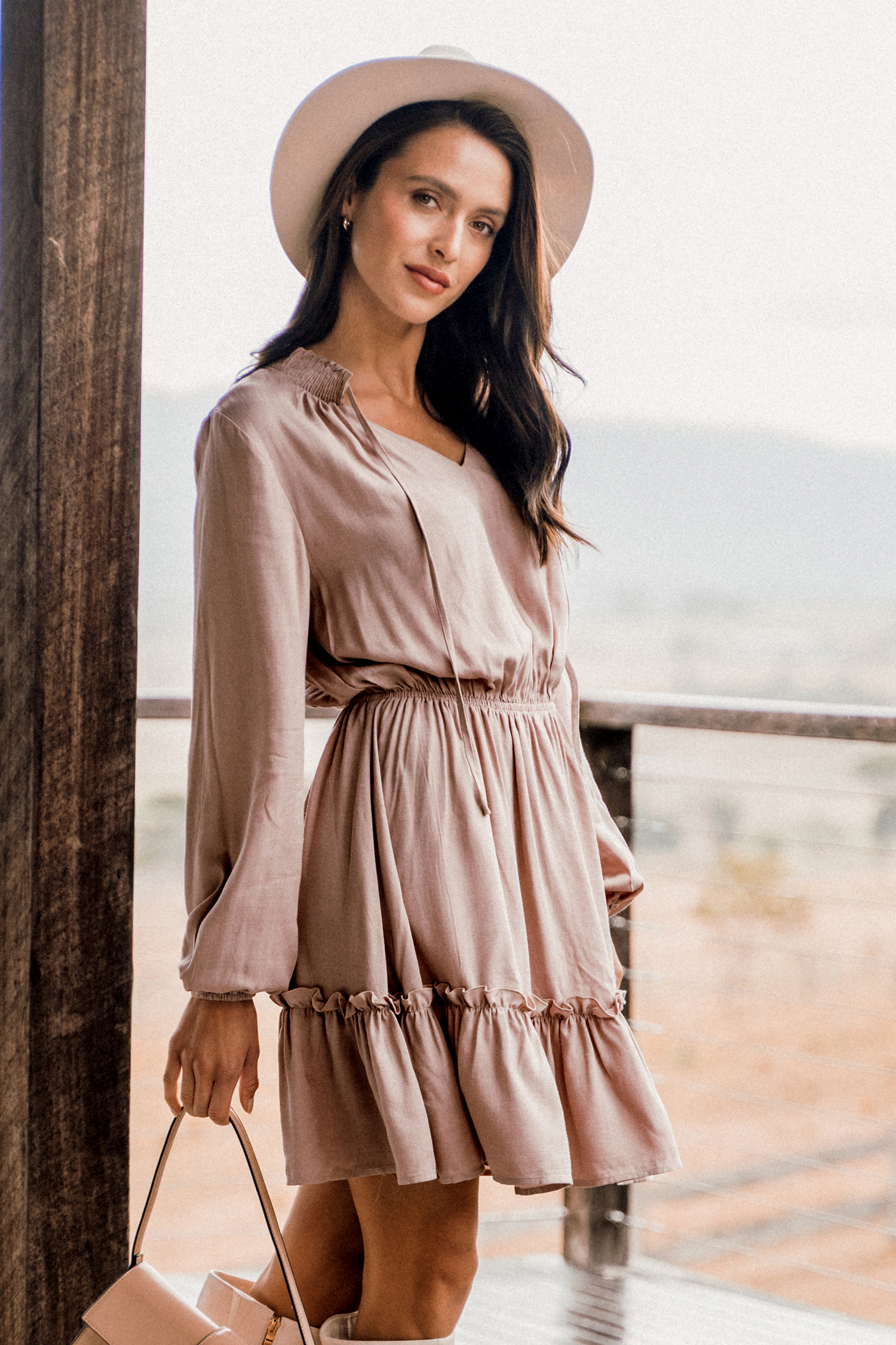 Mauve Ruffled Tie Neck A-Line MIni Dress