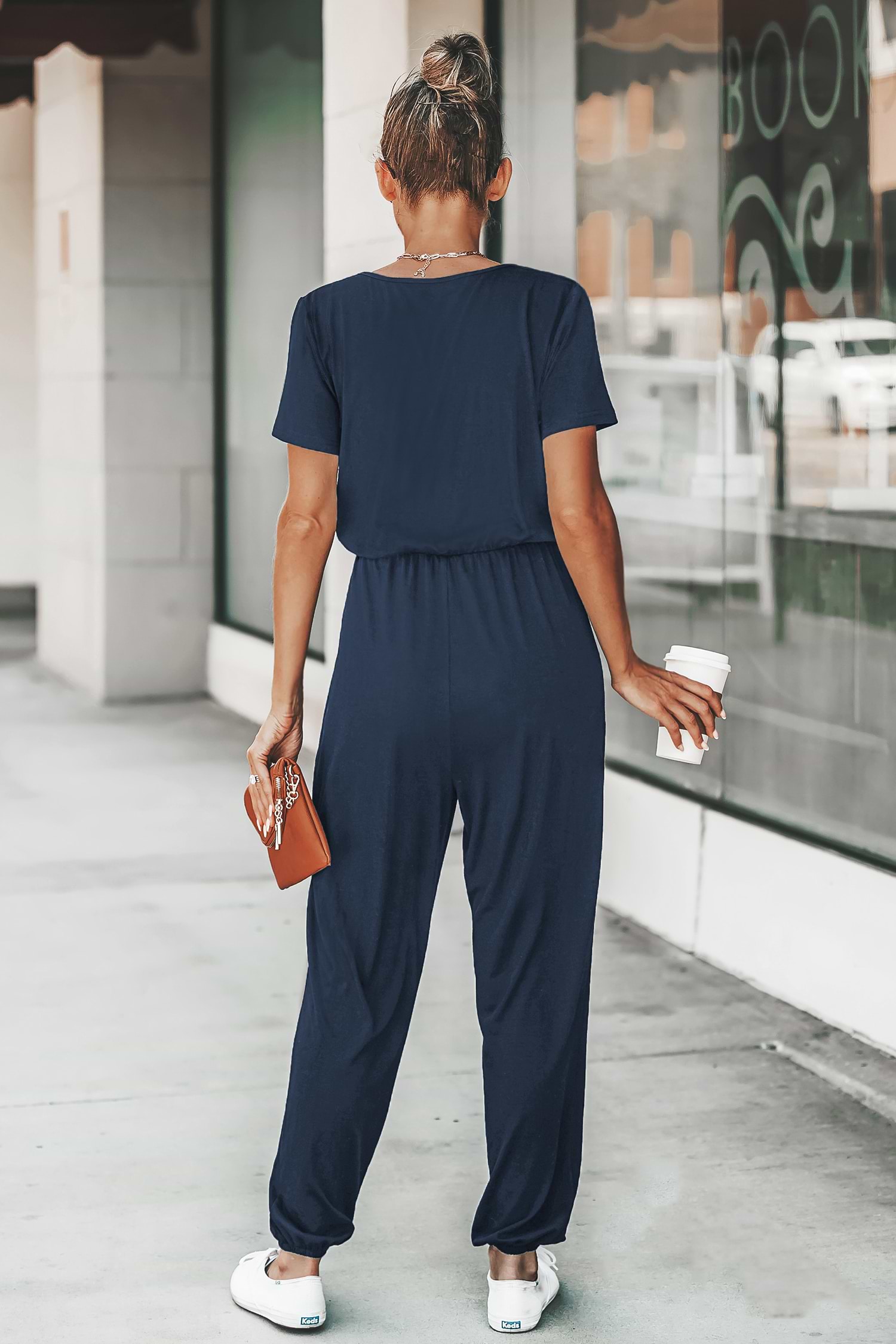 Crafted from a lightweight polyester-rayon-spandex blend (60/35/5), this piece drapes beautifully and comfortably for summer. We've added a hidden snap at the neckline for adjustable coverage and extra comfort. Experience the perfect blend of comfort and style with our Midnight Blue Surplice Jogger Jumpsuit. The elegant surplice neckline and relaxed jogger silhouette make this jumpsuit a go-to choice for effortlessly chic looks, whether you're out for a stroll or stepping out for the evening.
