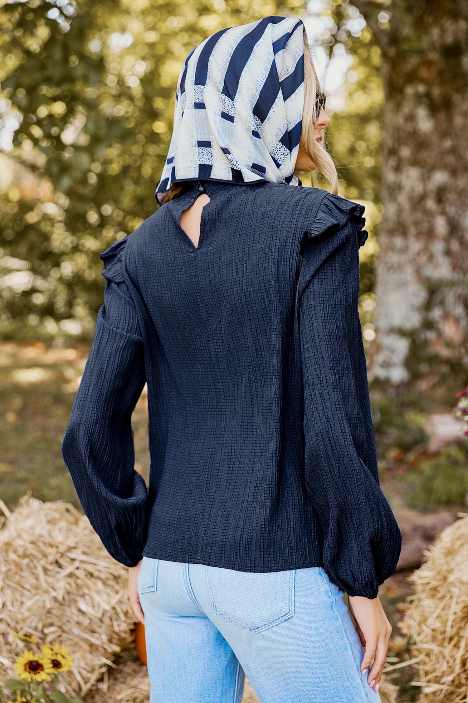 Navy Ruffled Mockneck Blouson Sleeve Top