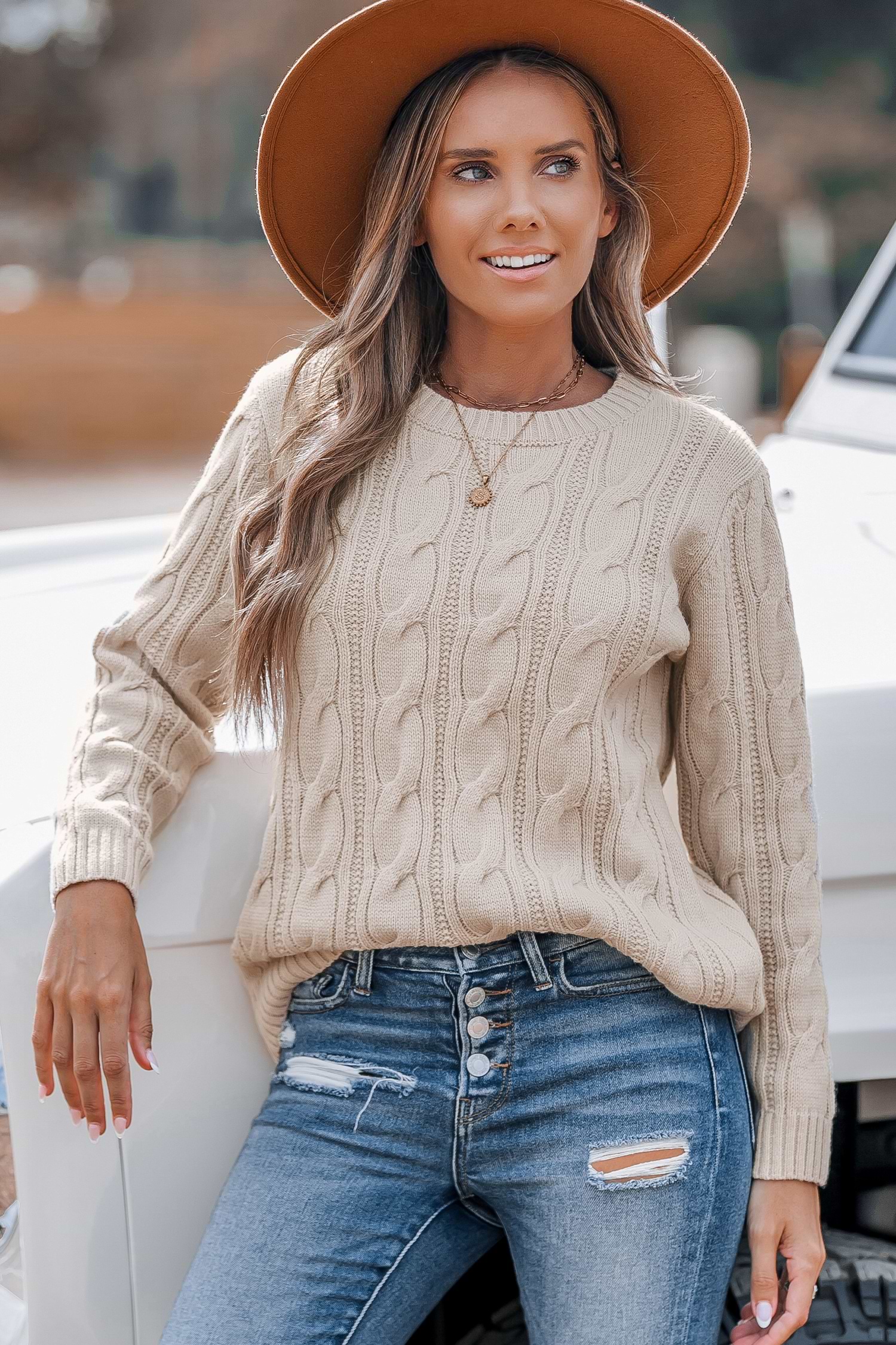 Neutral Round Neck Long Sleeve Cable Knit Sweater