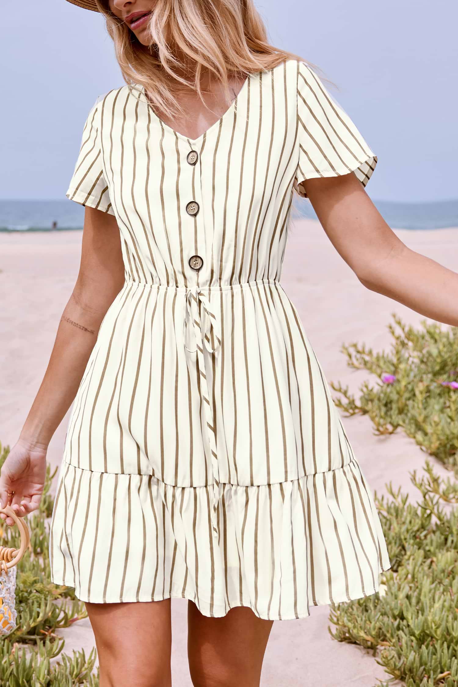 HomeNeutral Striped Short Sleeve V-Neck Mini Dress
