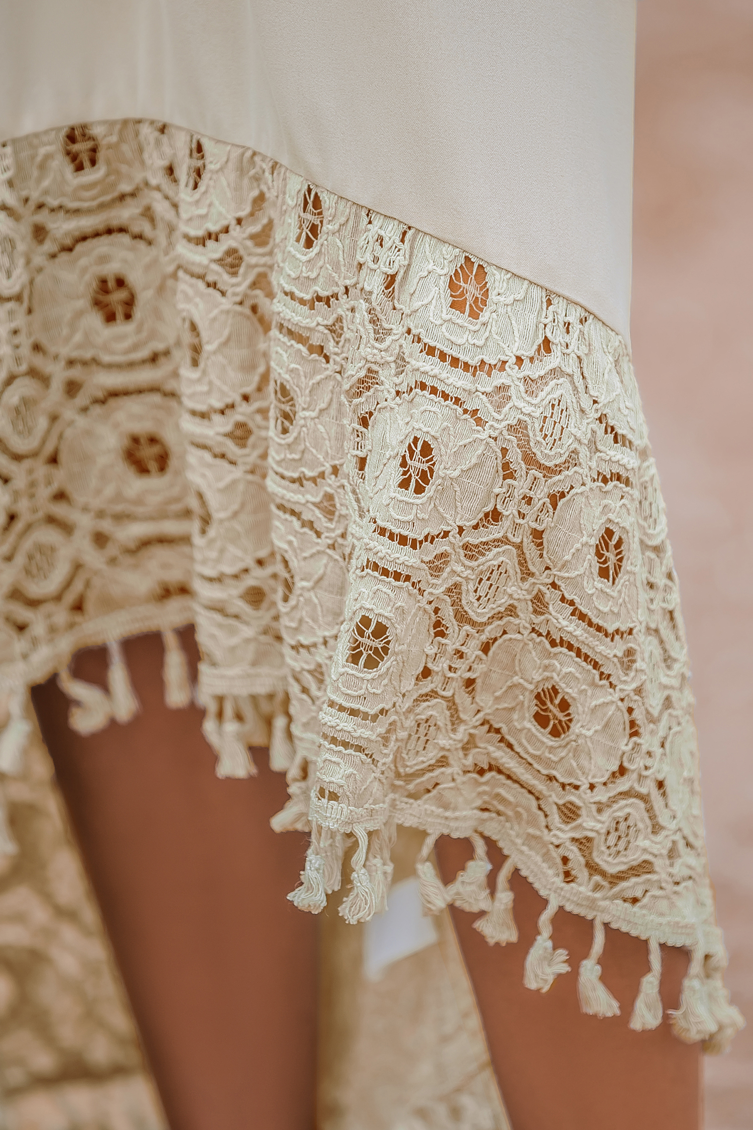 Neutral V-Neck Ruffled Sleeve Lace Hem Midi Dress