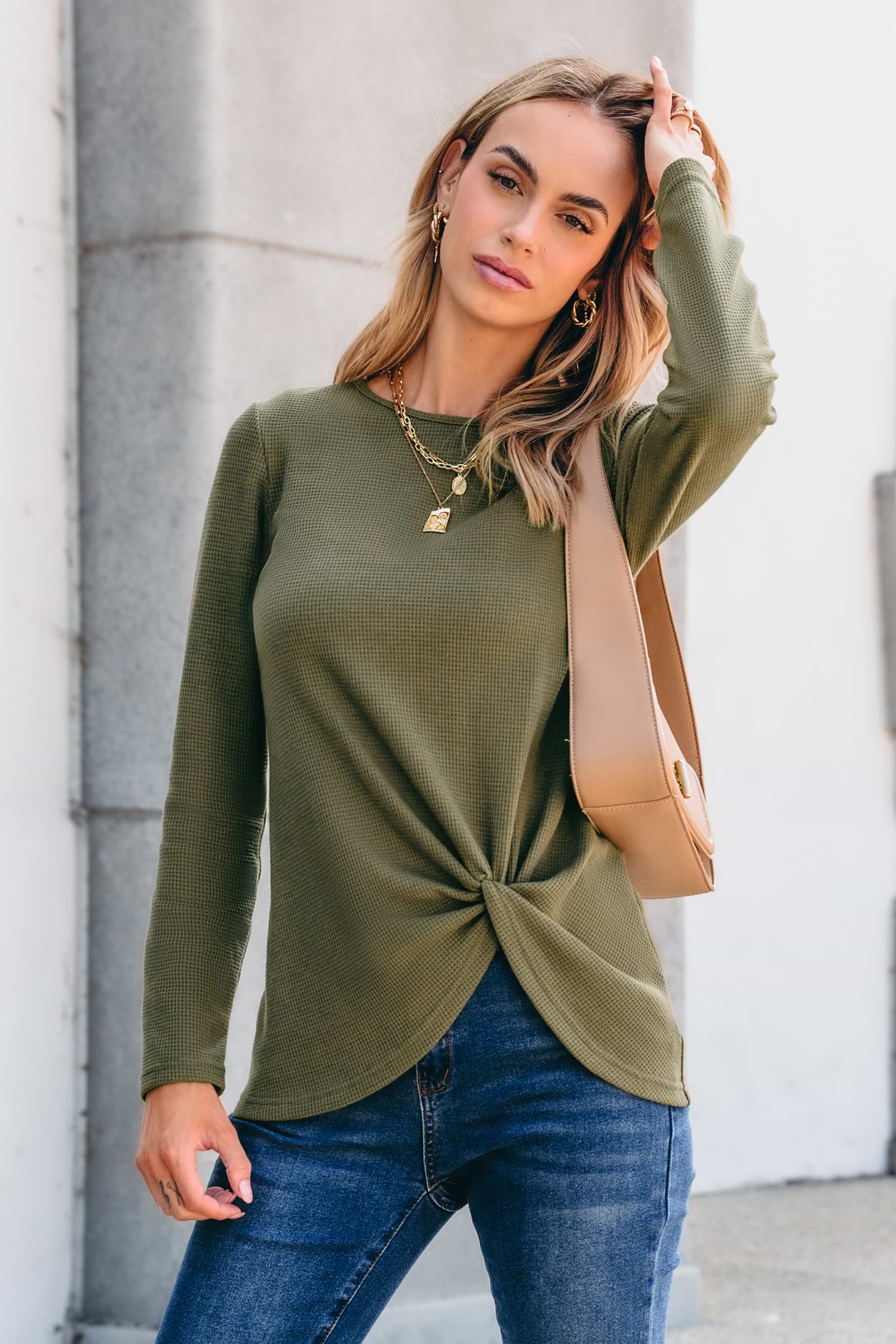 Olive Waffle Knit Hem Twist Long Sleeve Tee
