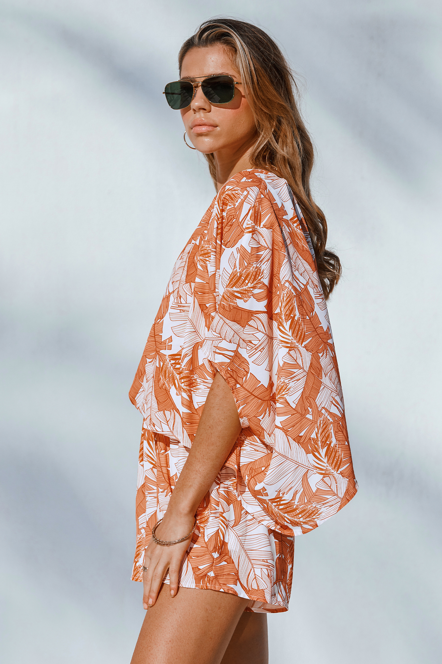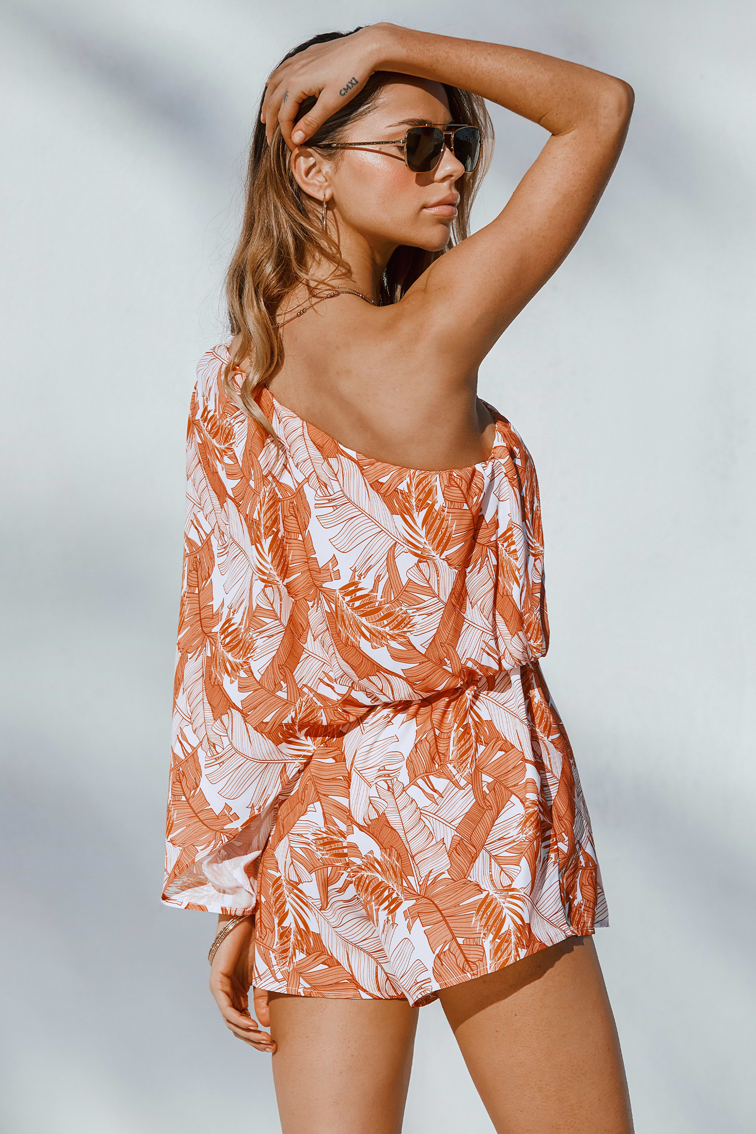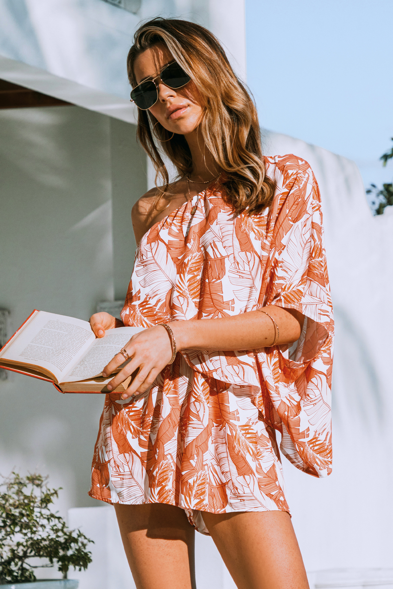 HomeOrange Tropical Leaf Print One-Shoulder Romper