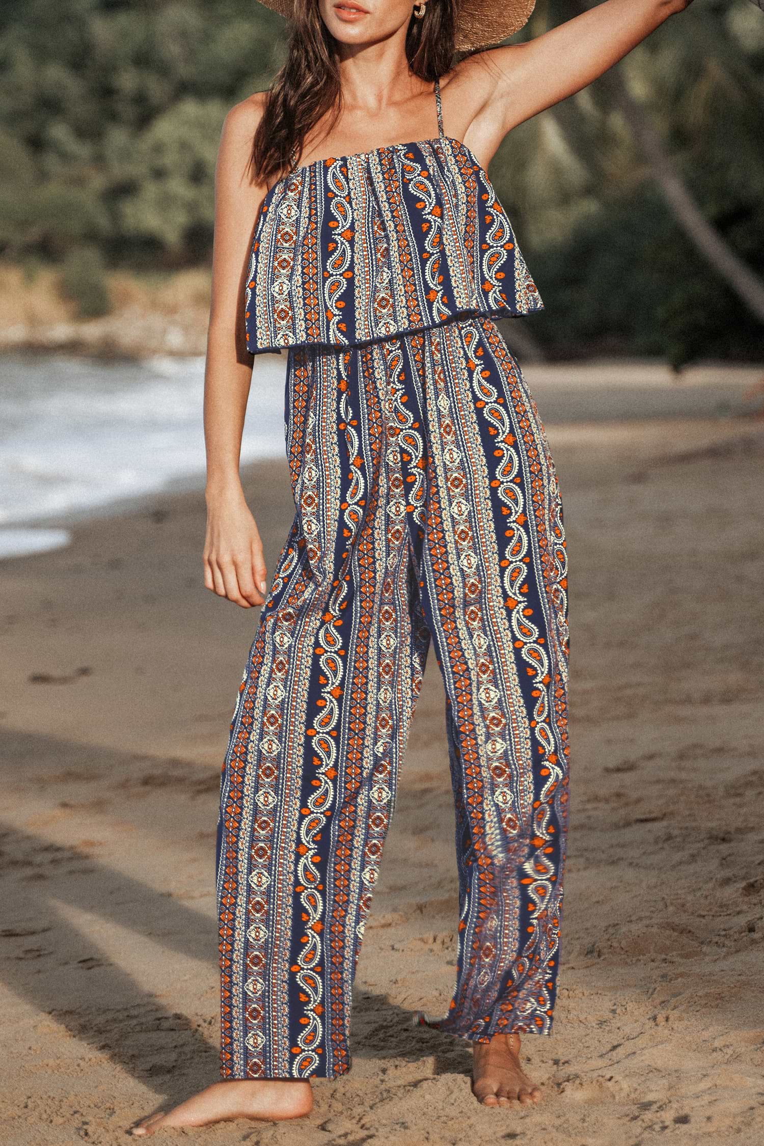 Toile Print Halter Neck Straight Leg Jumpsuit