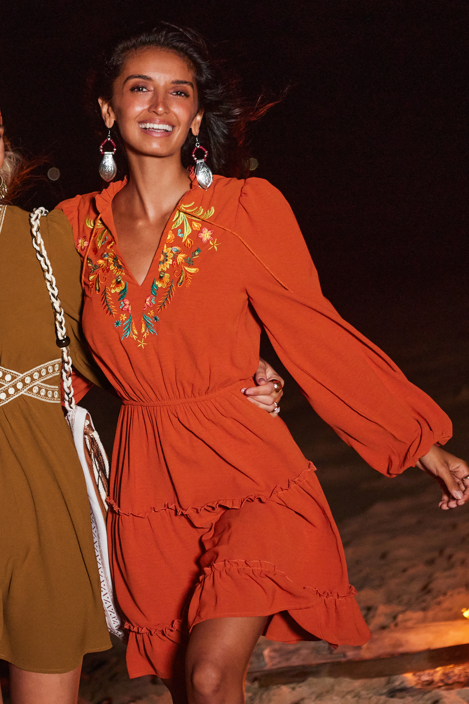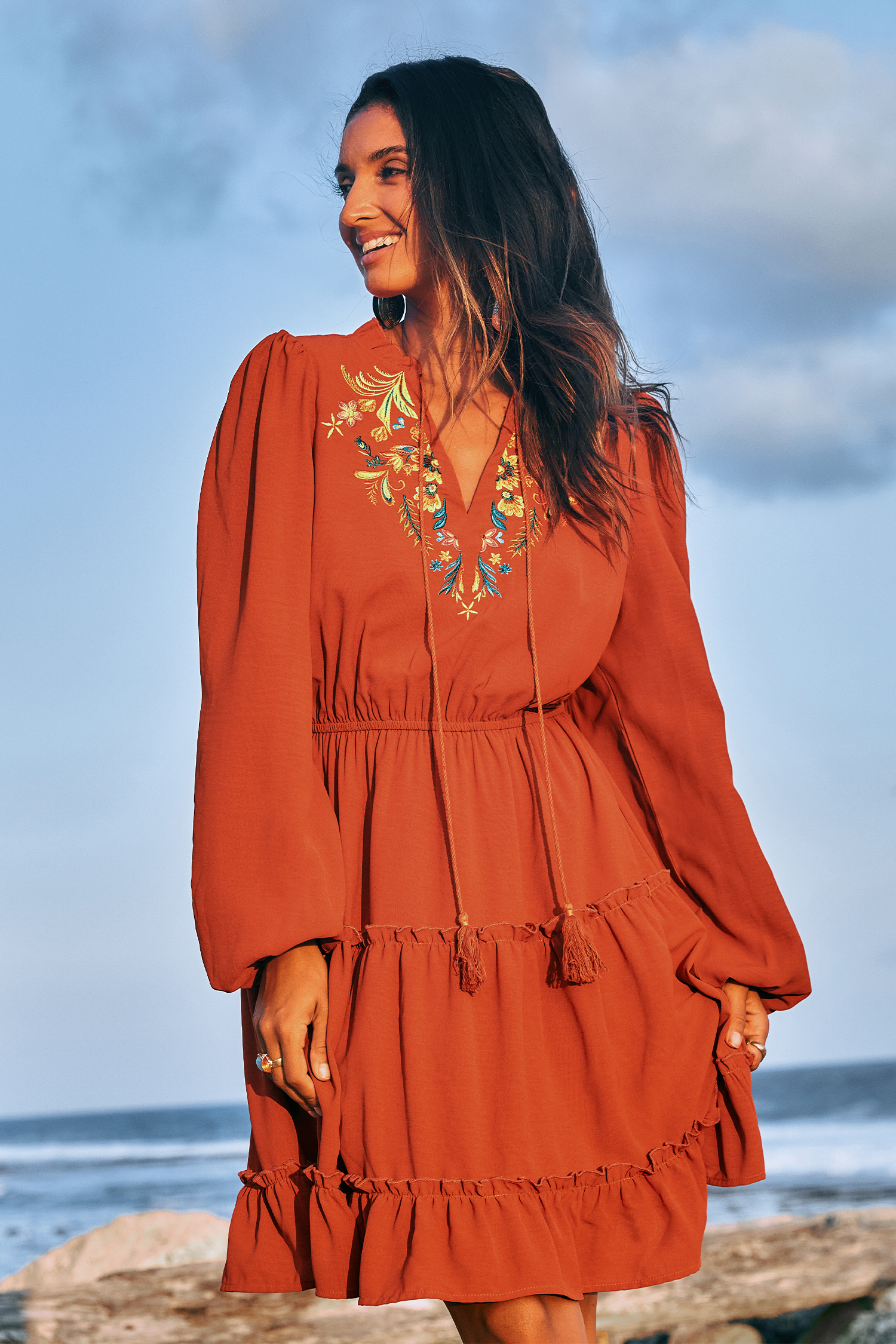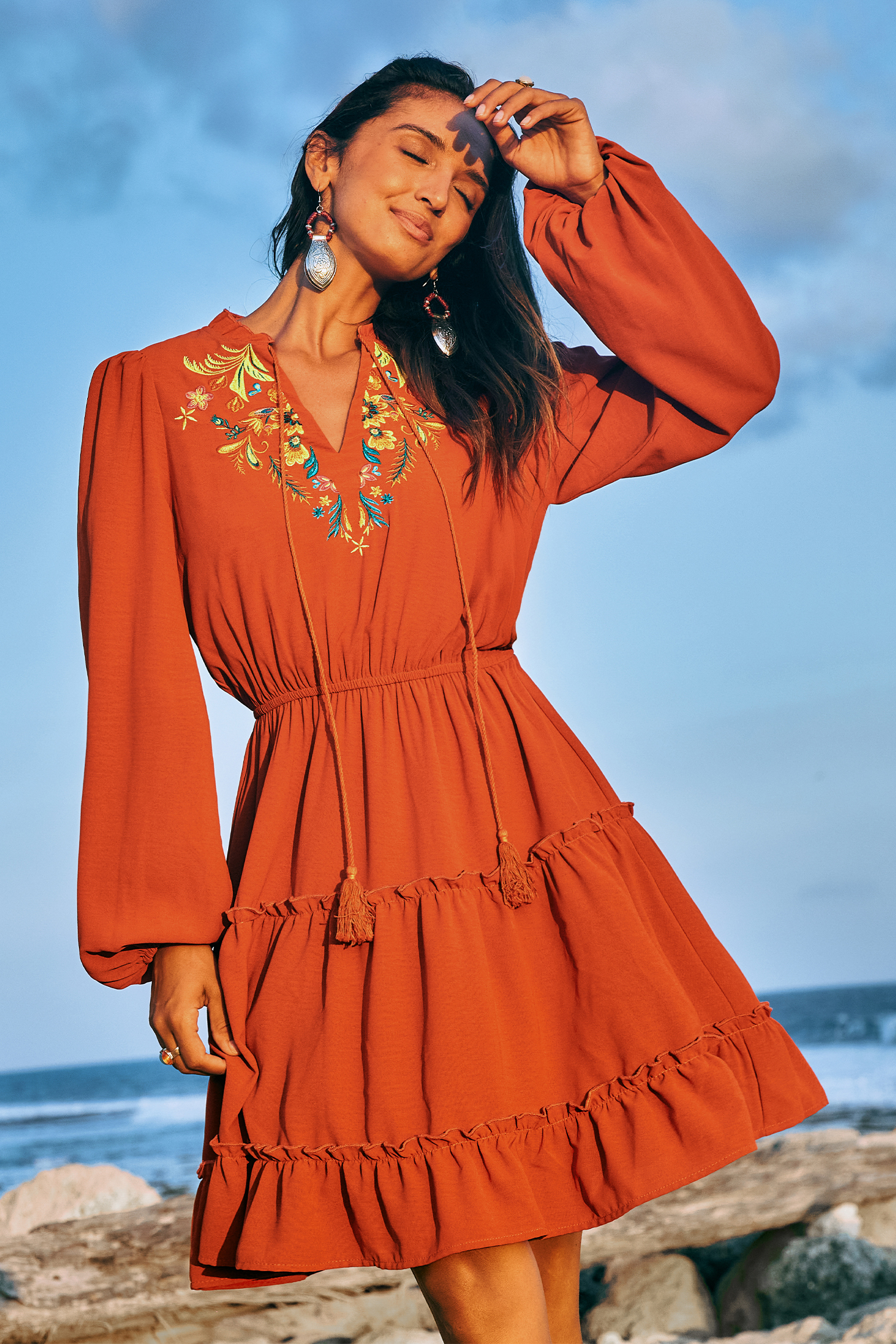 Step into fall with the Pumpkin Latte Orange Mini Dress! The notched neckline, long sleeves, and mini length bring cozy-cute vibes perfect for crisp autumn days.