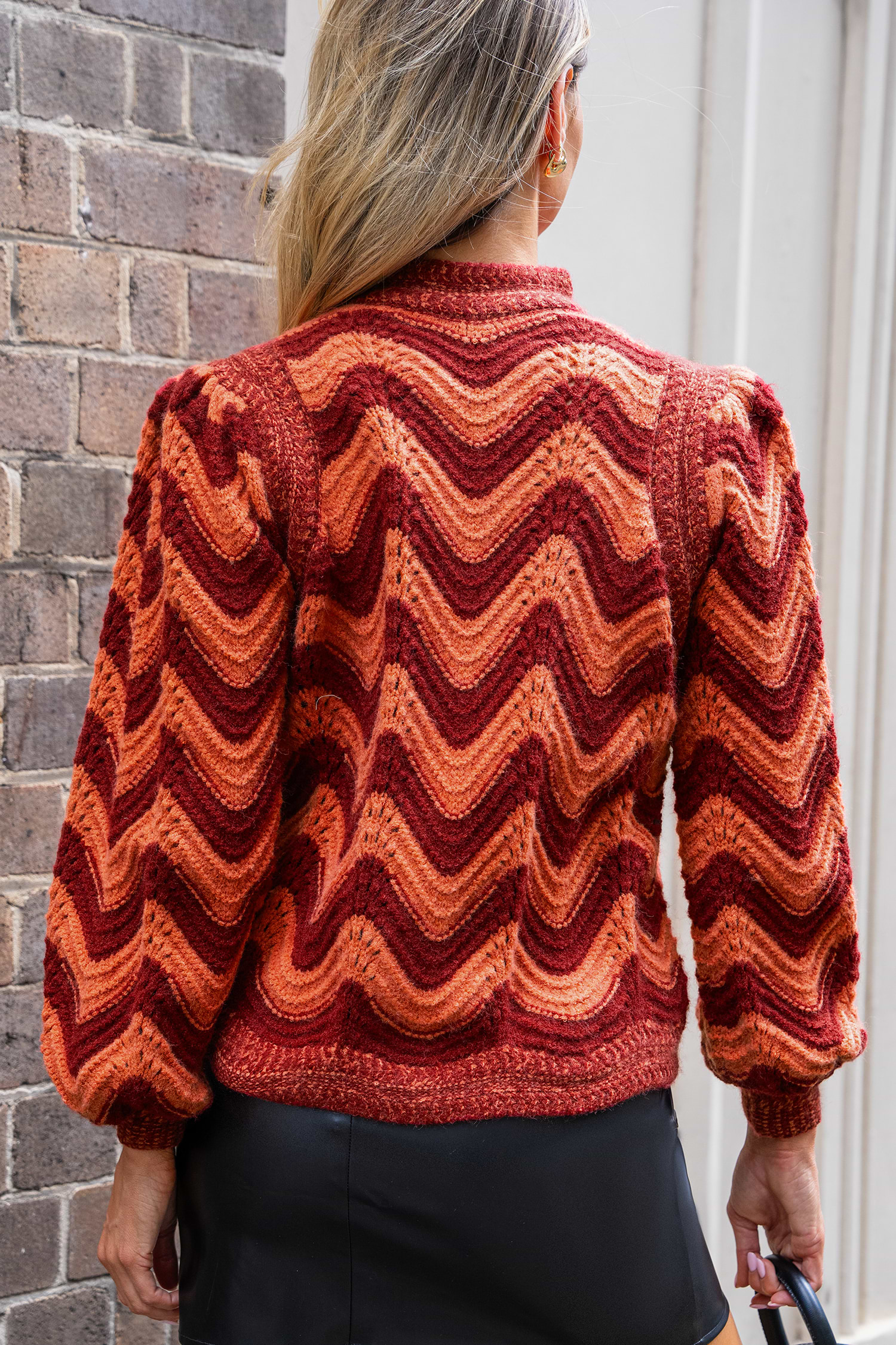 Red & Orange Chevron Puff Sleeve Mockneck Top