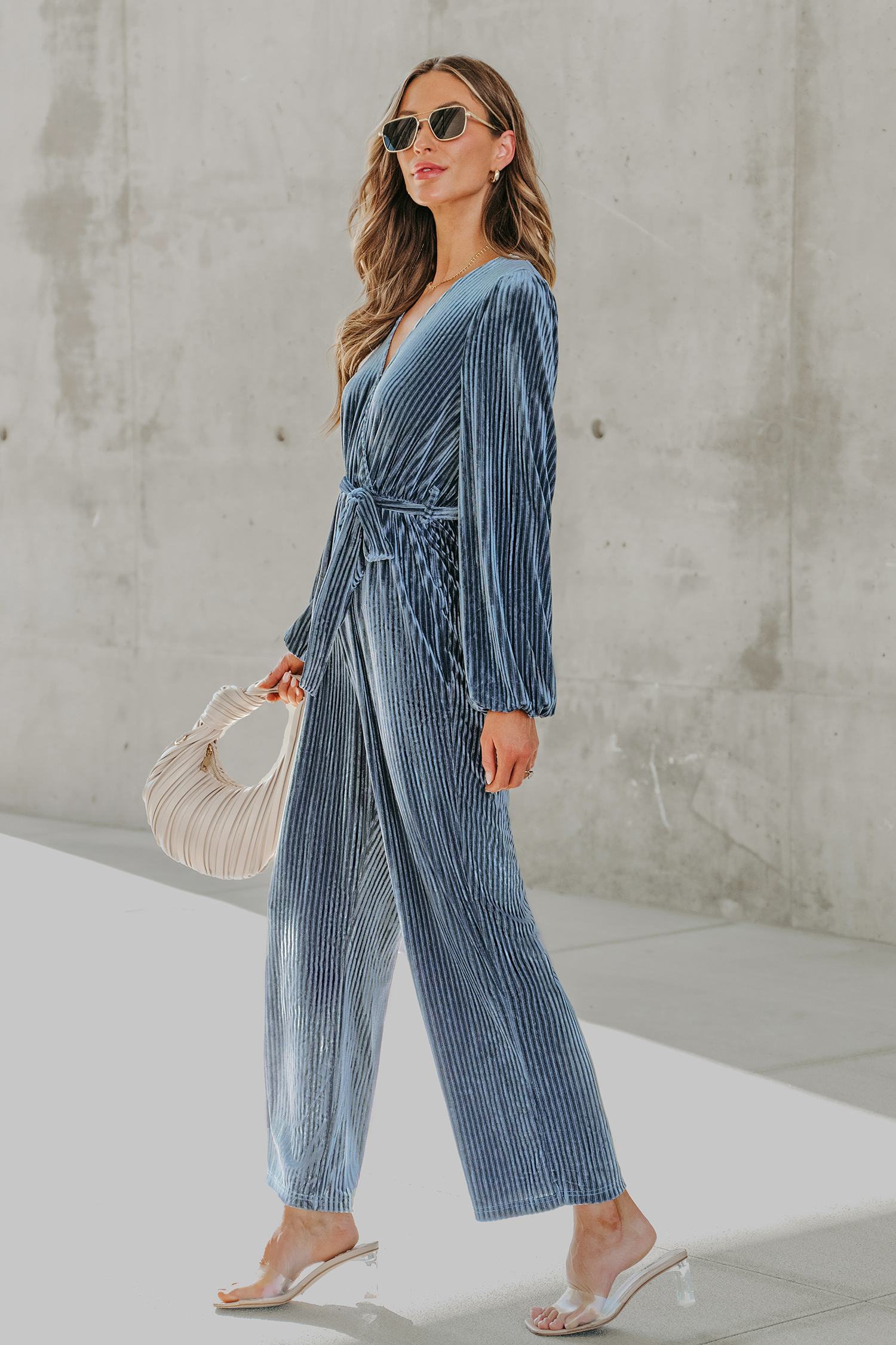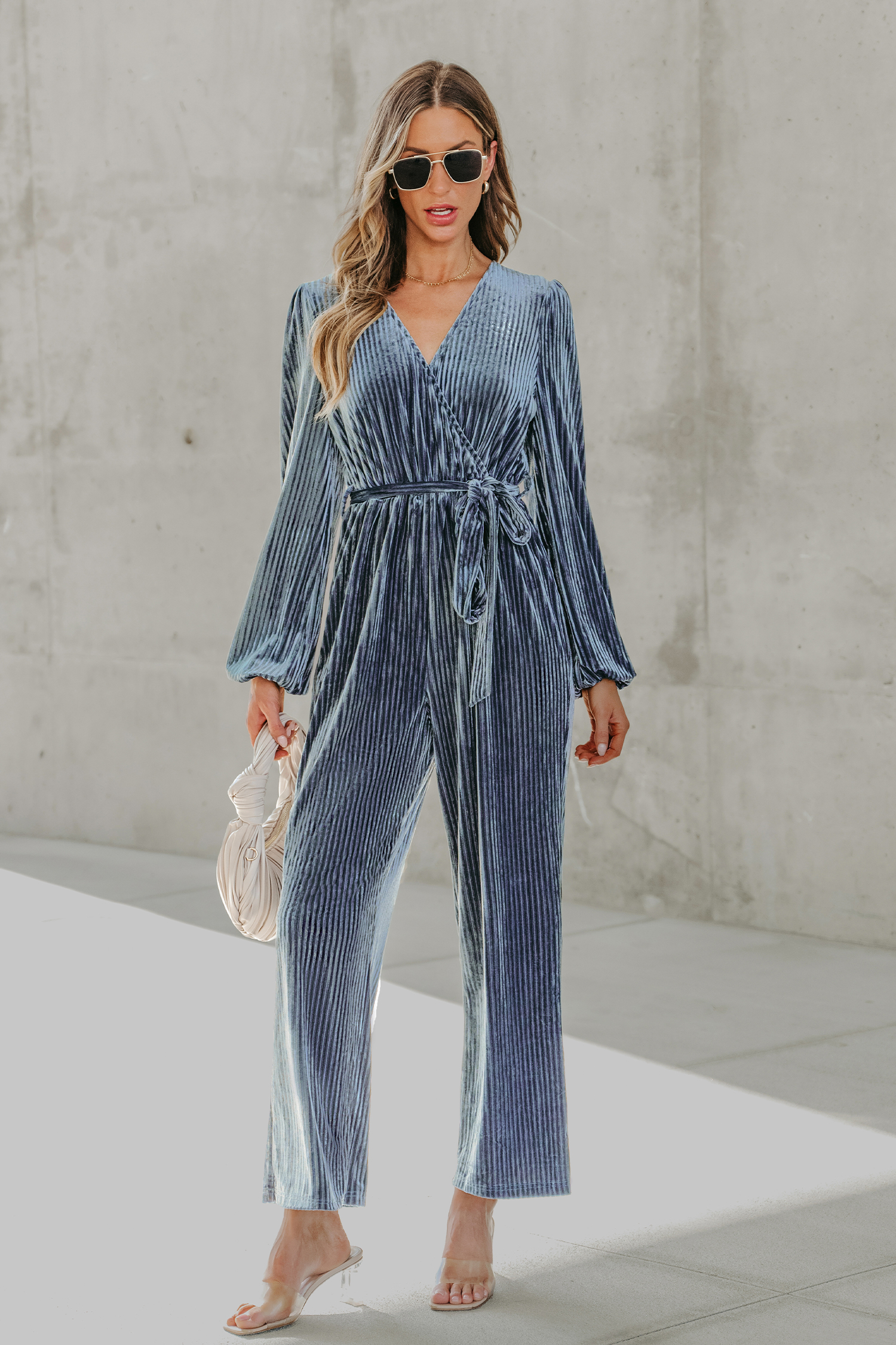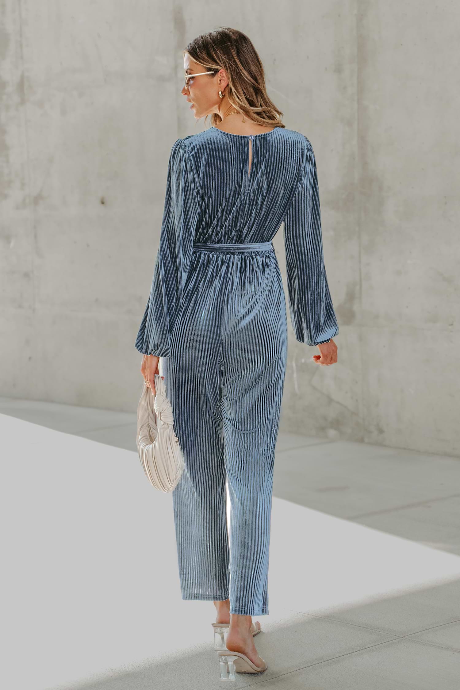 Ribbed Velvet Belted Long Sleeve Jumpsuit