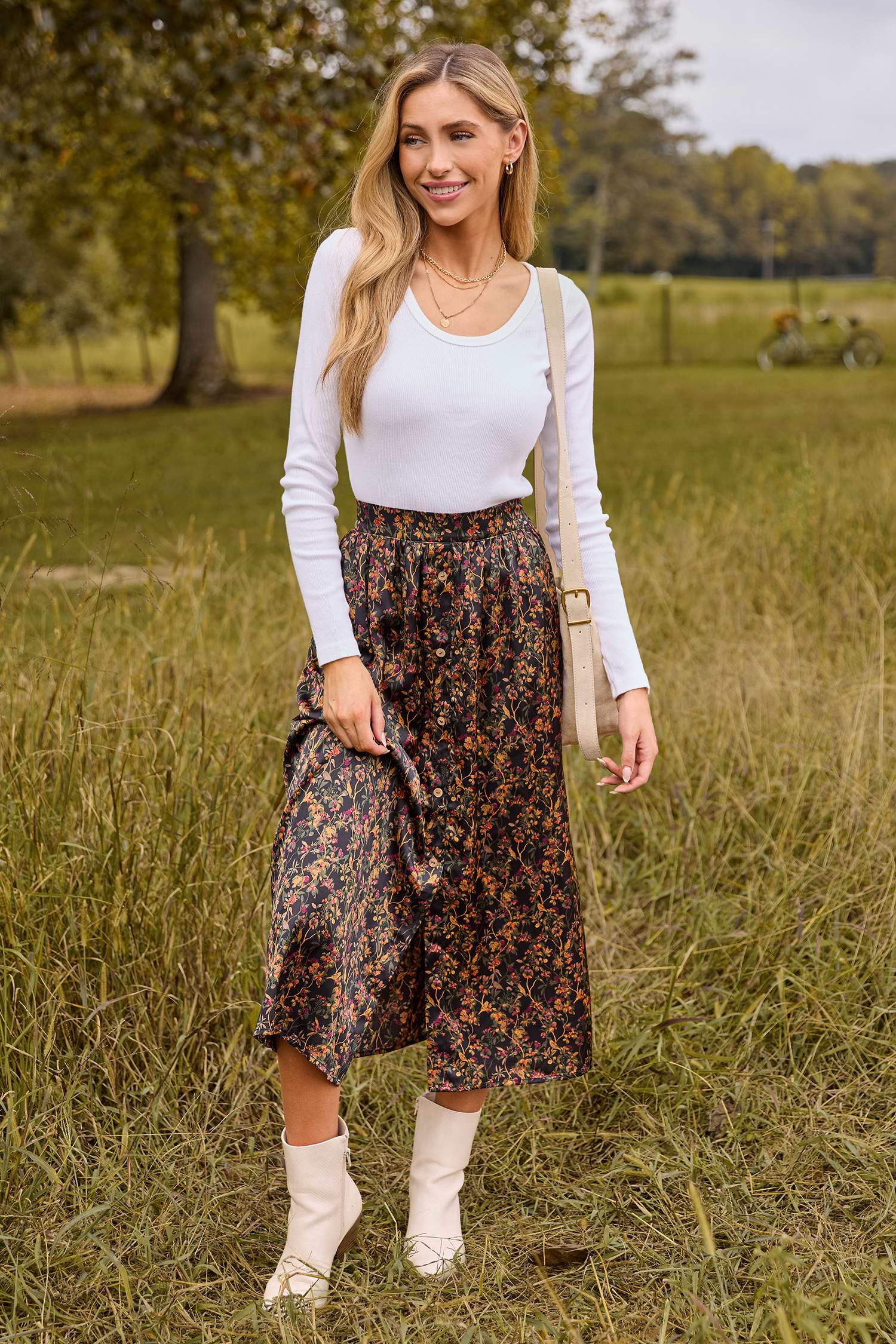 Satin Floral Front Button Midi Skirt
