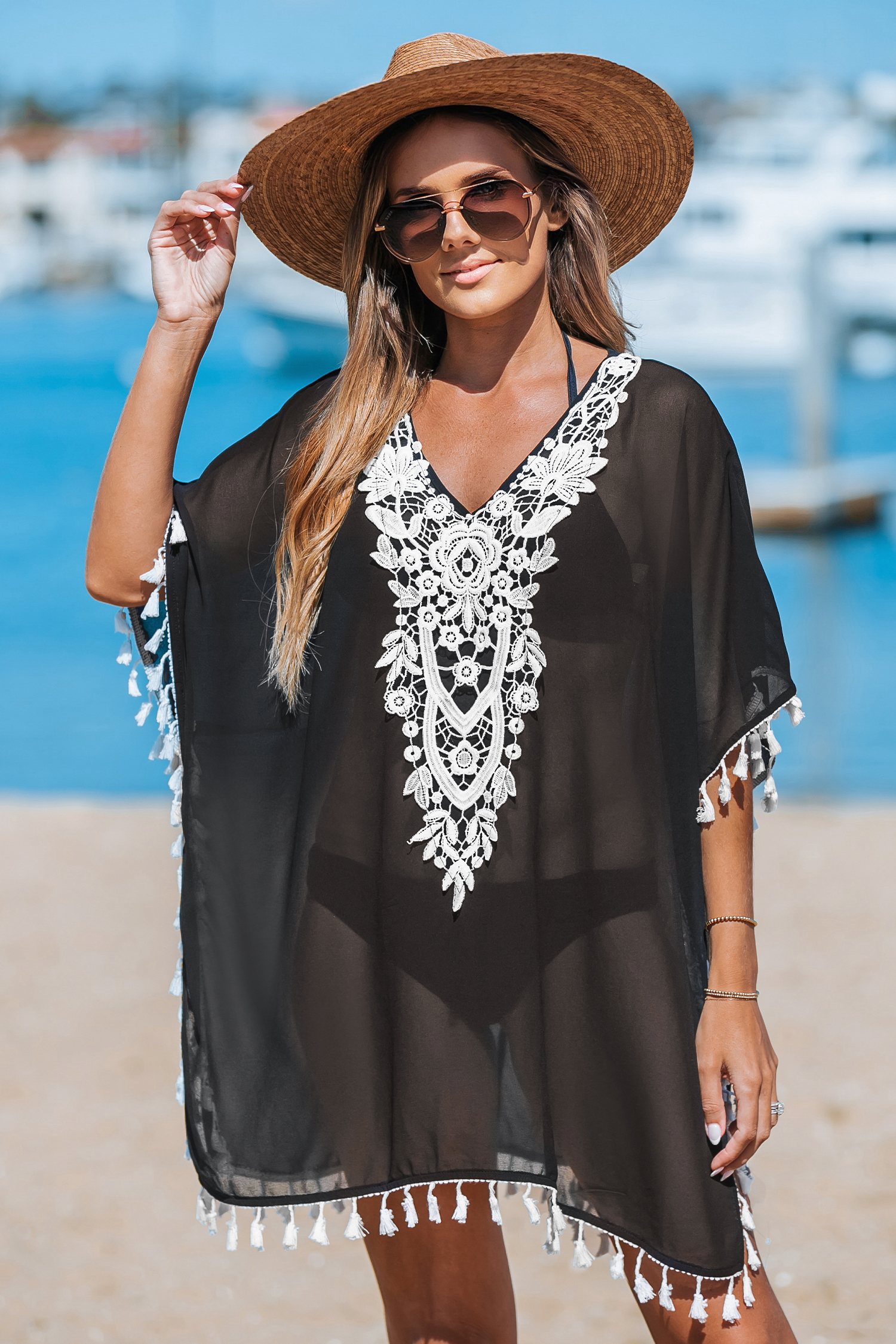 Sheer Black & White Lace Tassel Trim Cover-Up